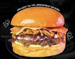 Pan artesanal, carne angus, pulled pork BBQ, tocineta ahumada, fusión de queso philadelphia y cheddar, maduro, lechuga, y salsa de la casa.