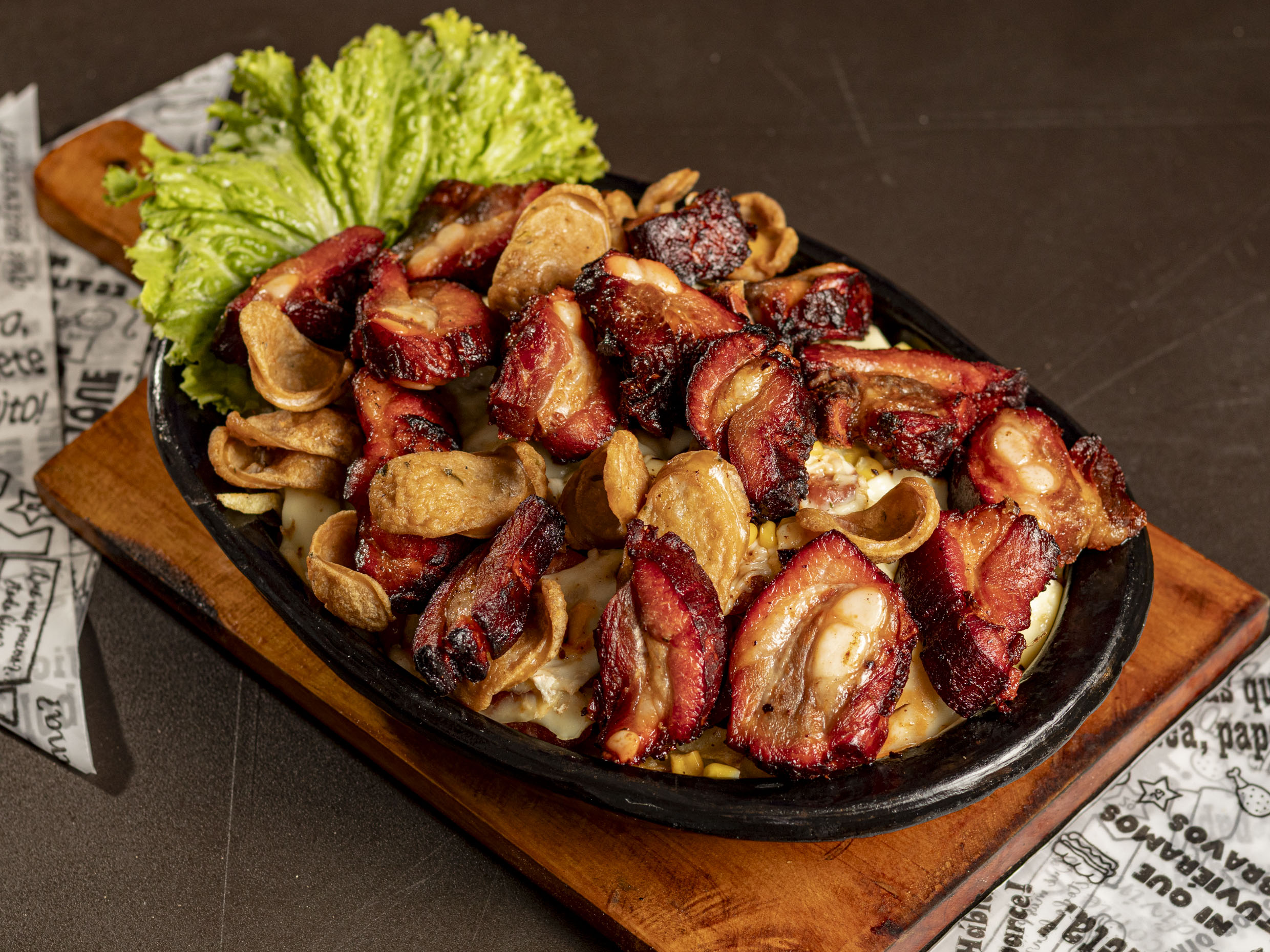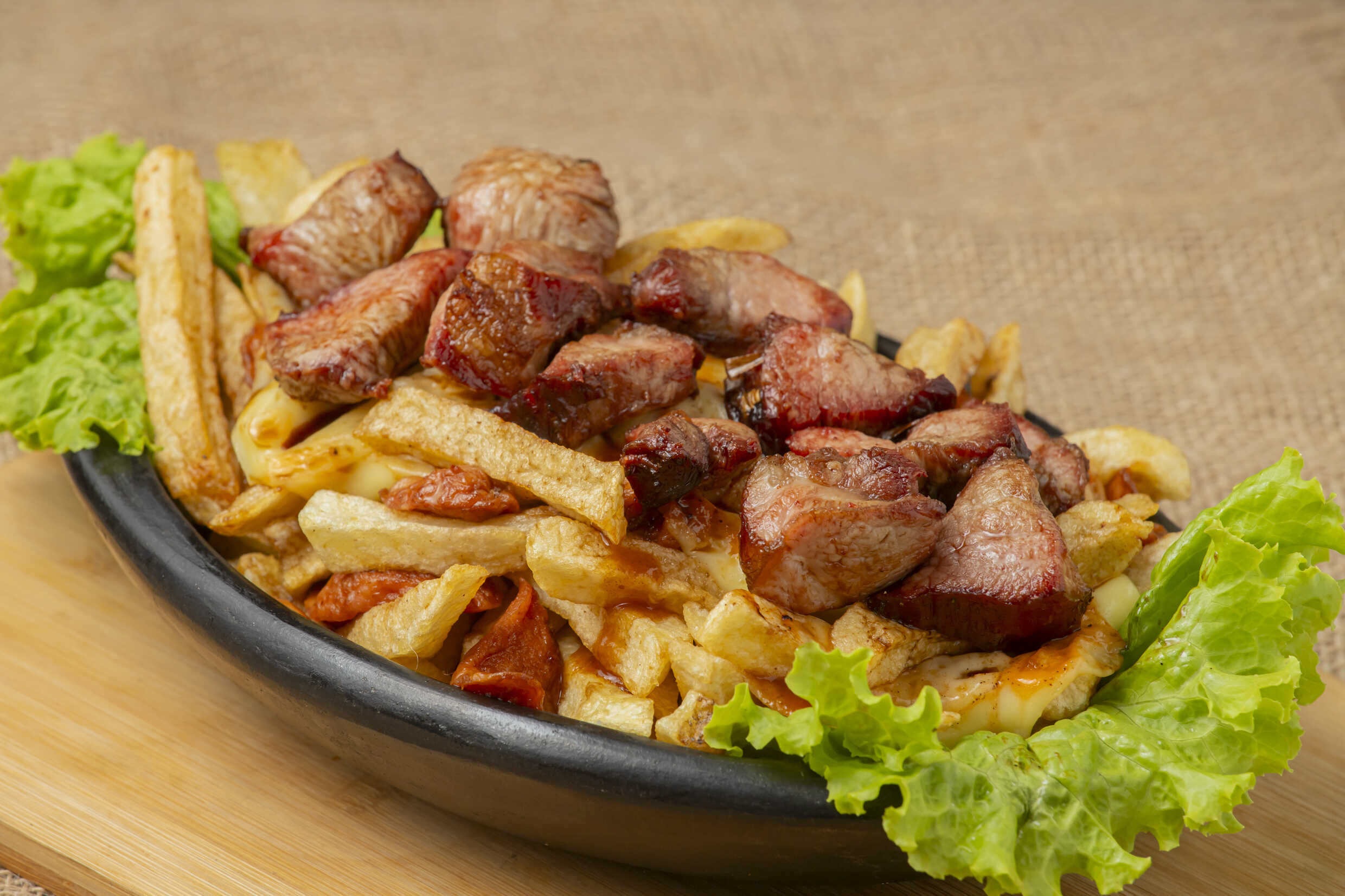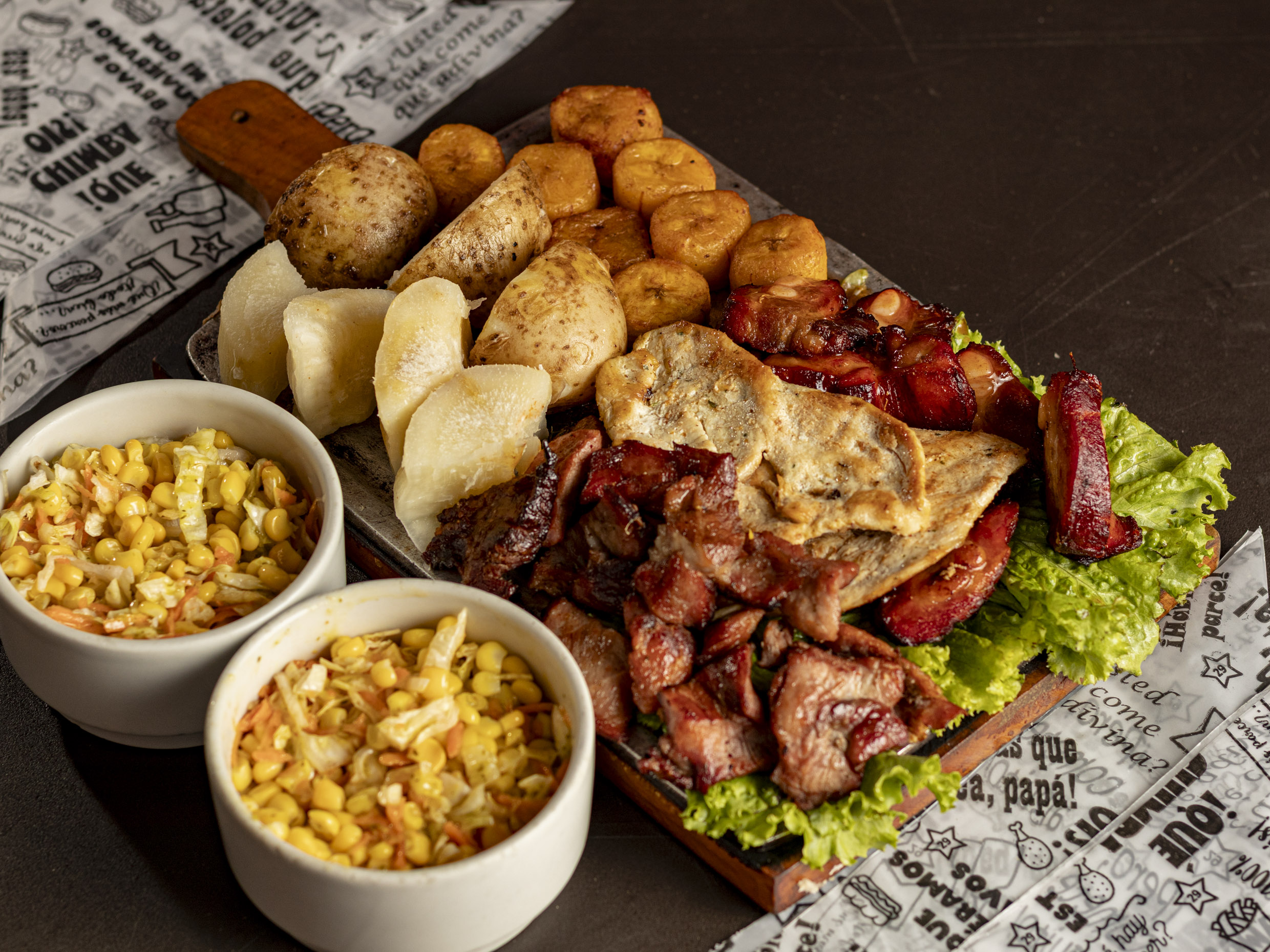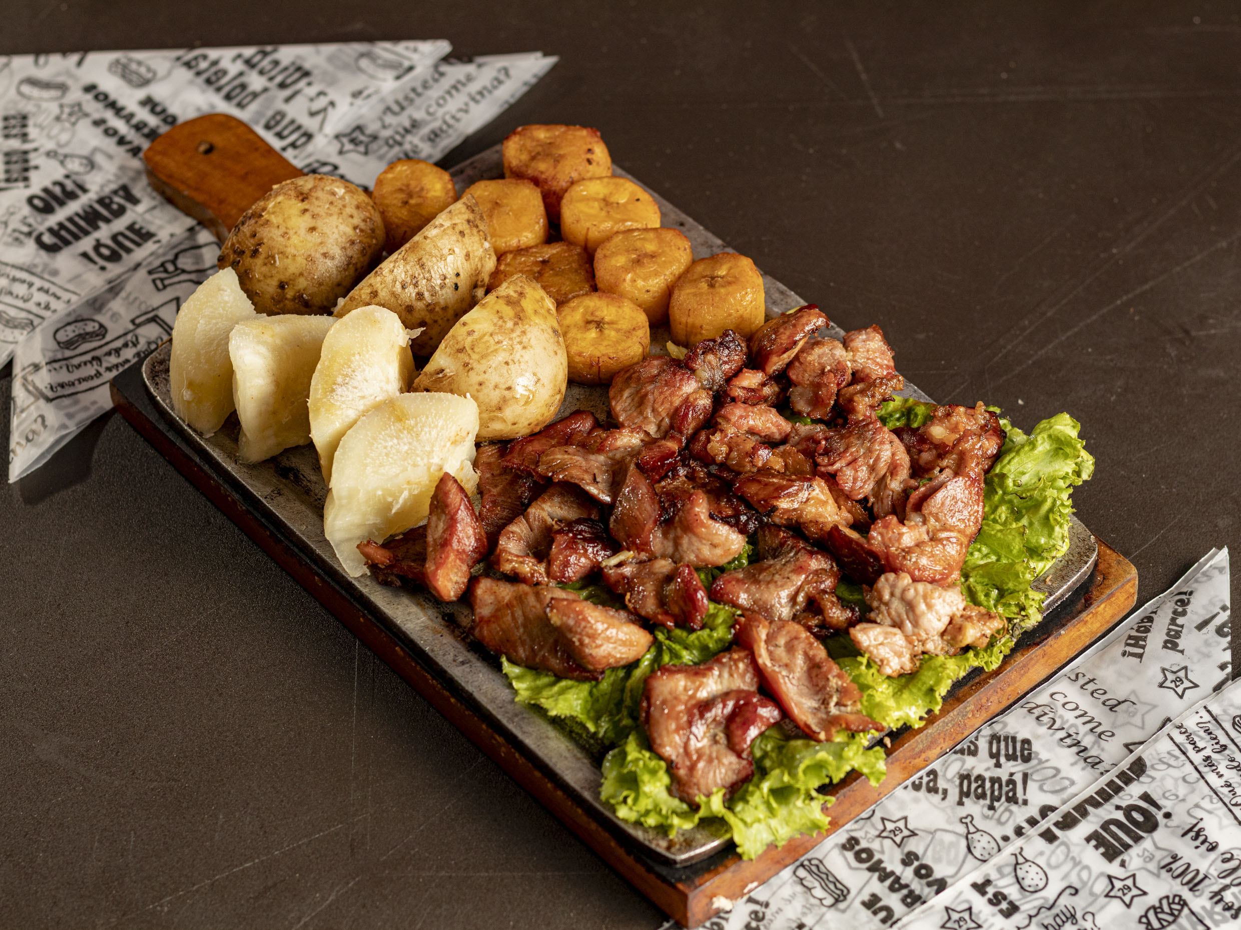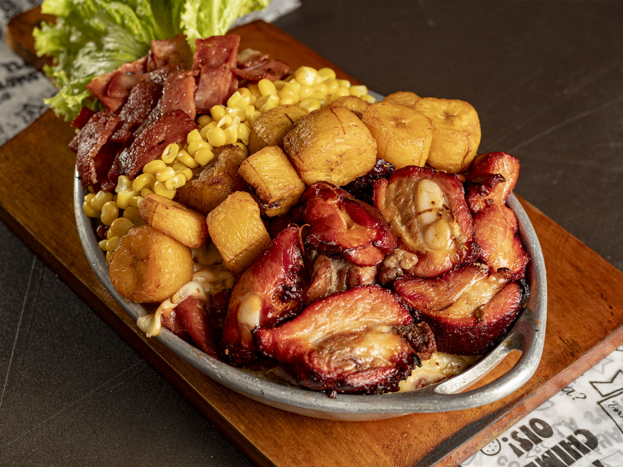 Aprox. 100 gr costilla (peso crudo), Aprox. 150 gr chorizo(peso crudo), Aprox.200gr (Peso crudo)salchicha ahumada, 100gr Pollo, maíz, ripio, papas a la francesa, triple queso y salsas de la casa.