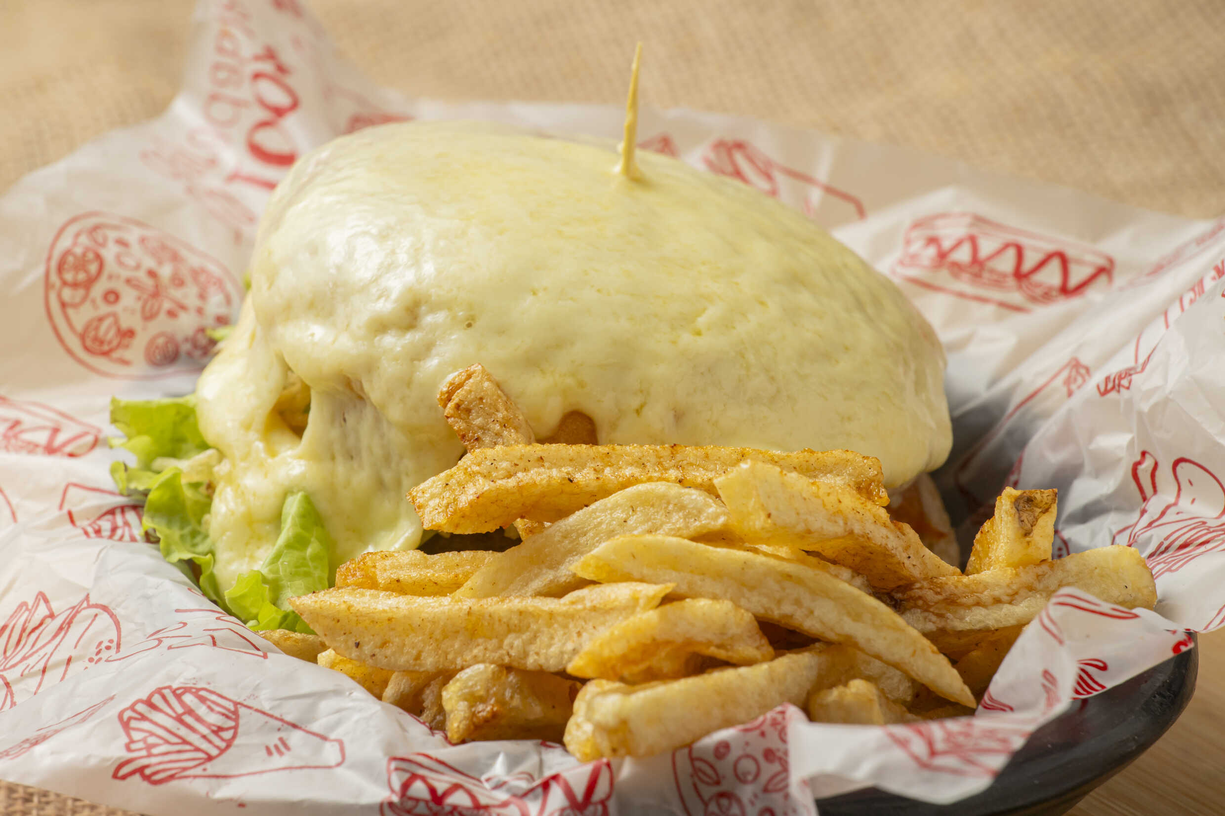 Carne artesanal, lechuga, queso, tomate, ripio y salsas de la casa más porción de papas a la francesa.
