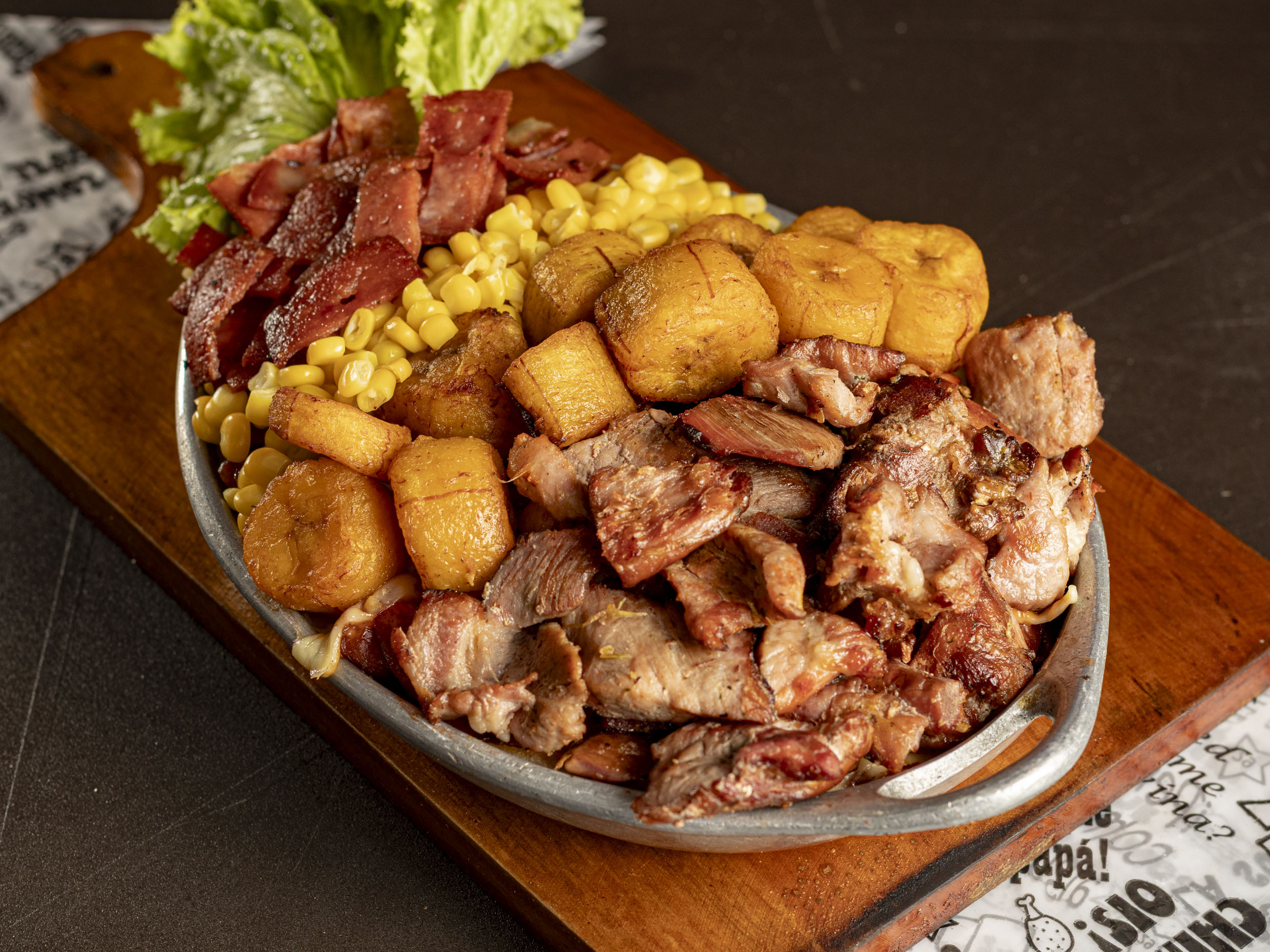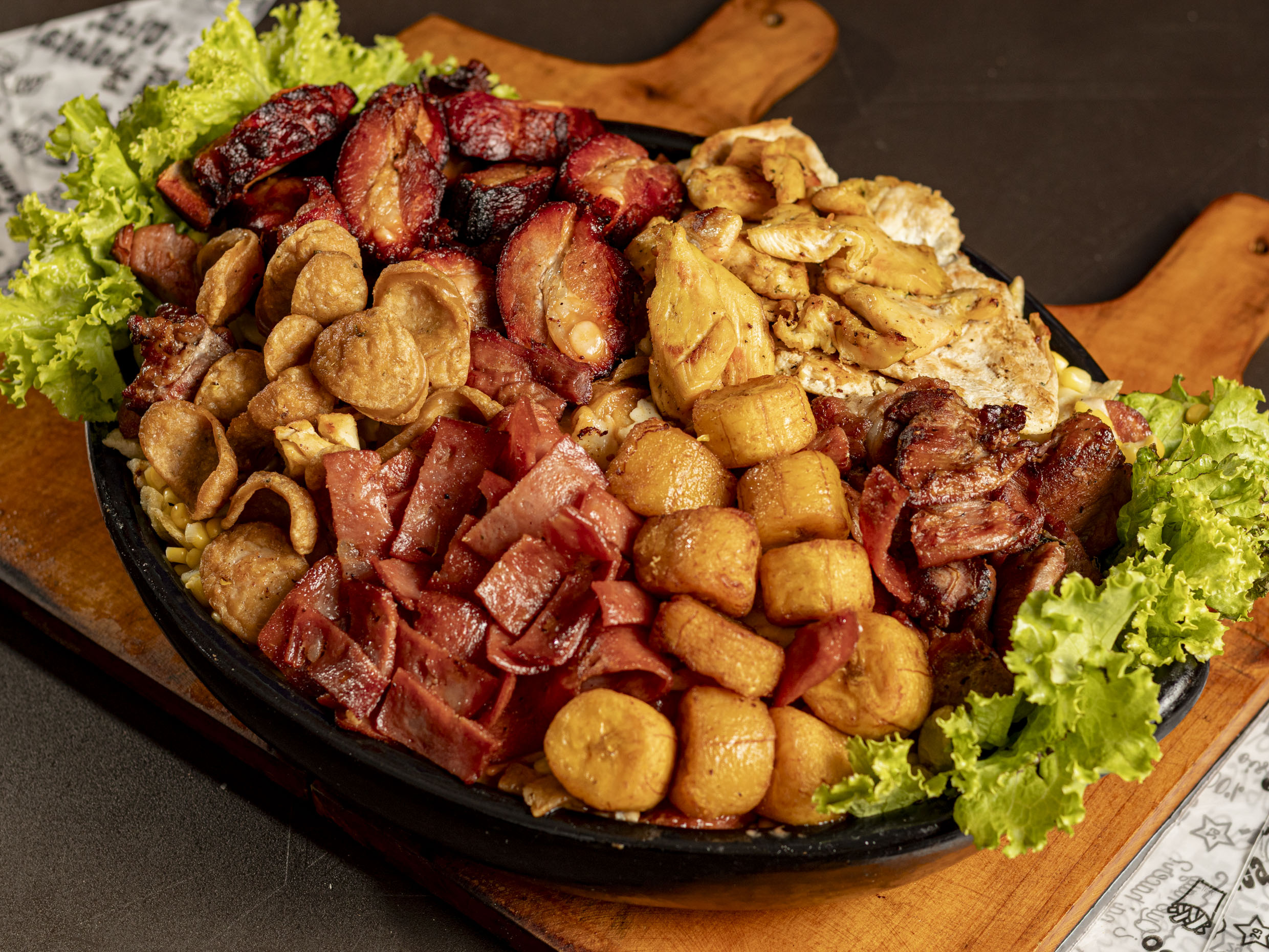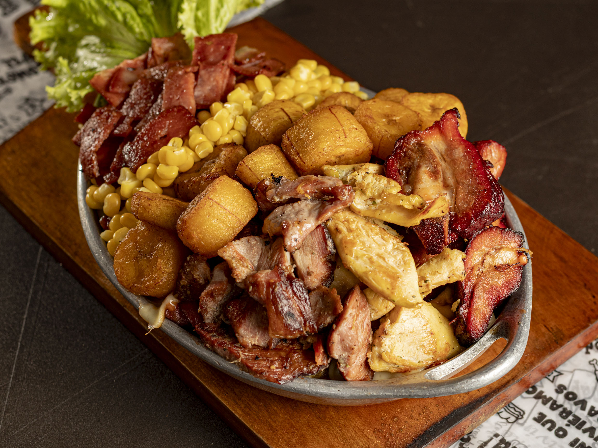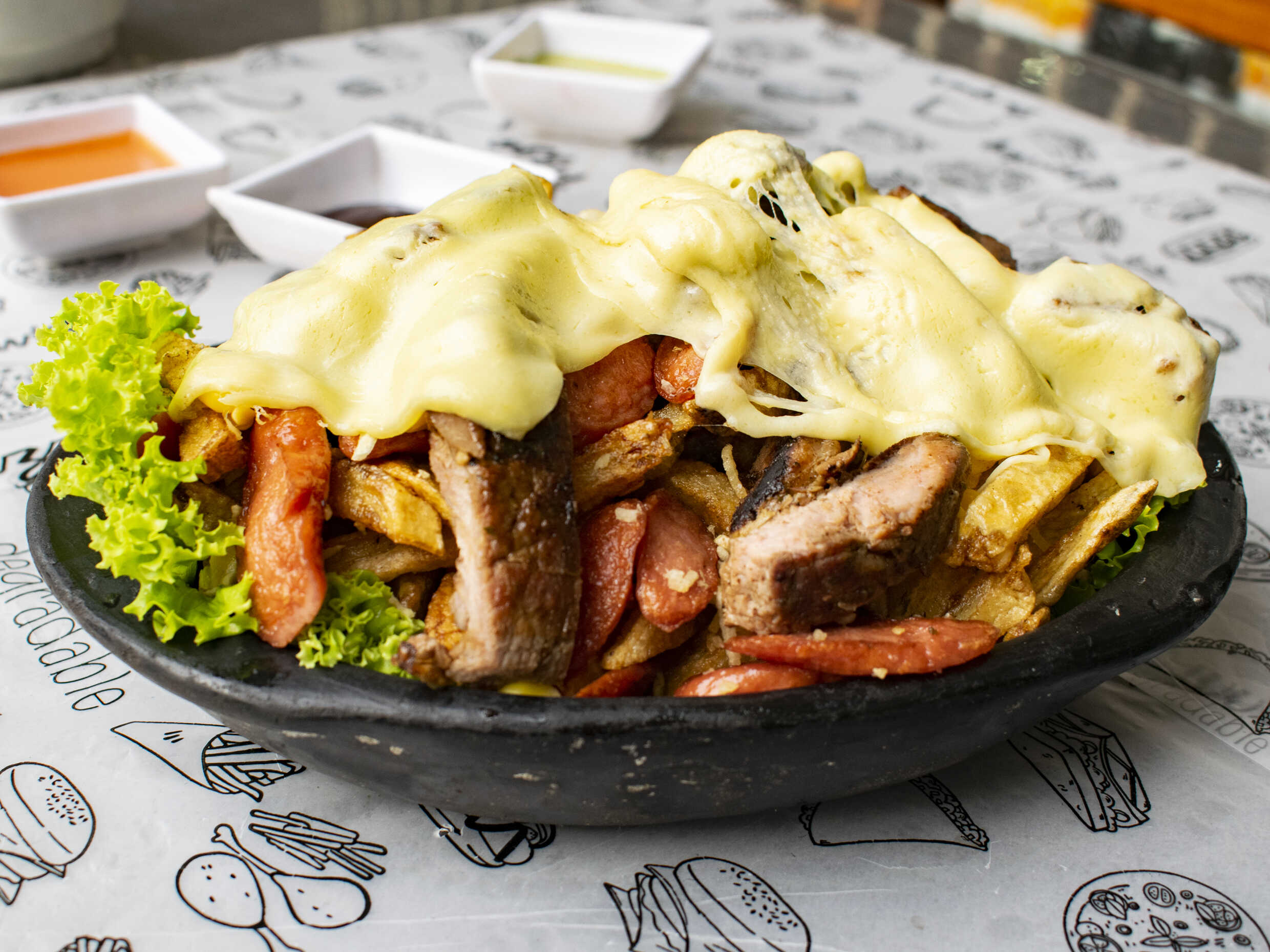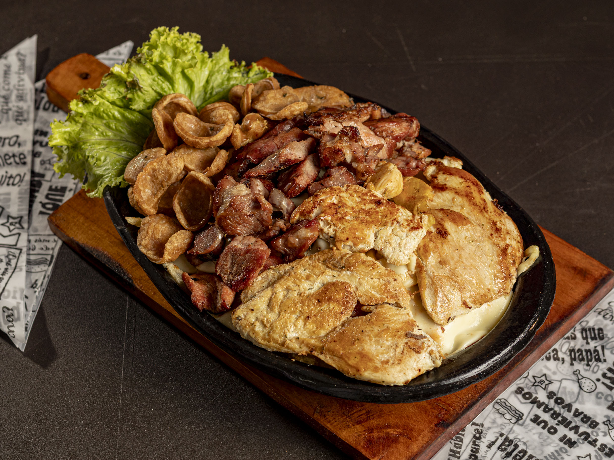 150 gr chorizo, 200 gr de carne a la llanera, 200 gr salchicha ahumada, 200 gr Pollo, maíz, ripio, papas a la francesa, cuatro quesos y salsas de la casa.