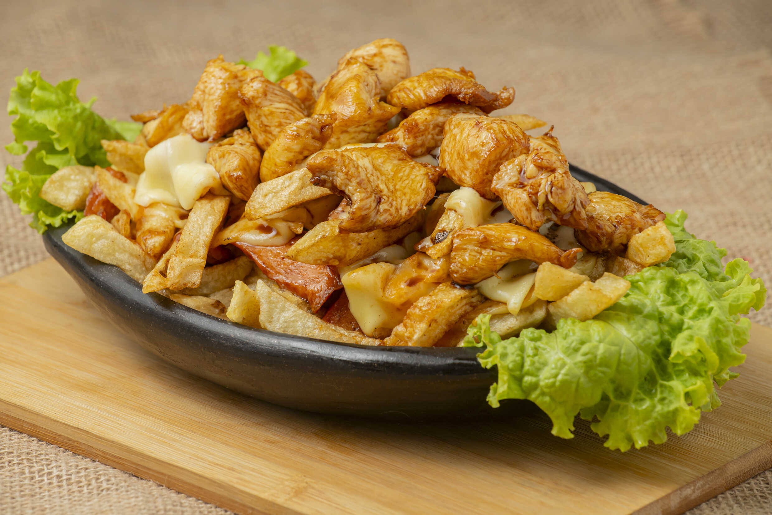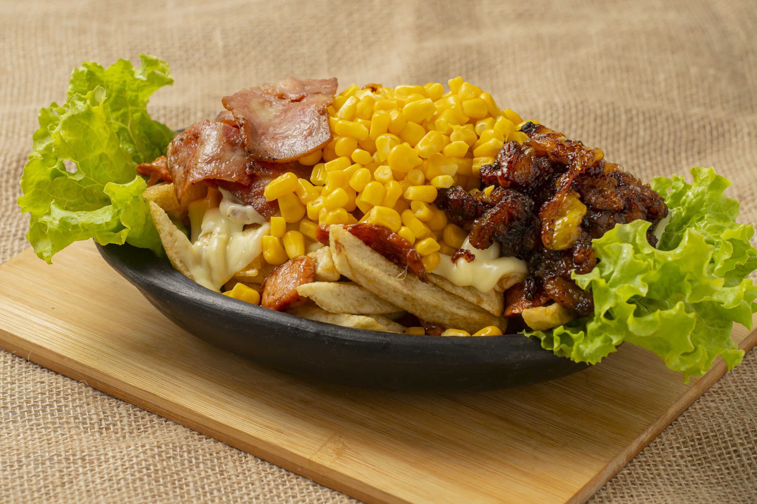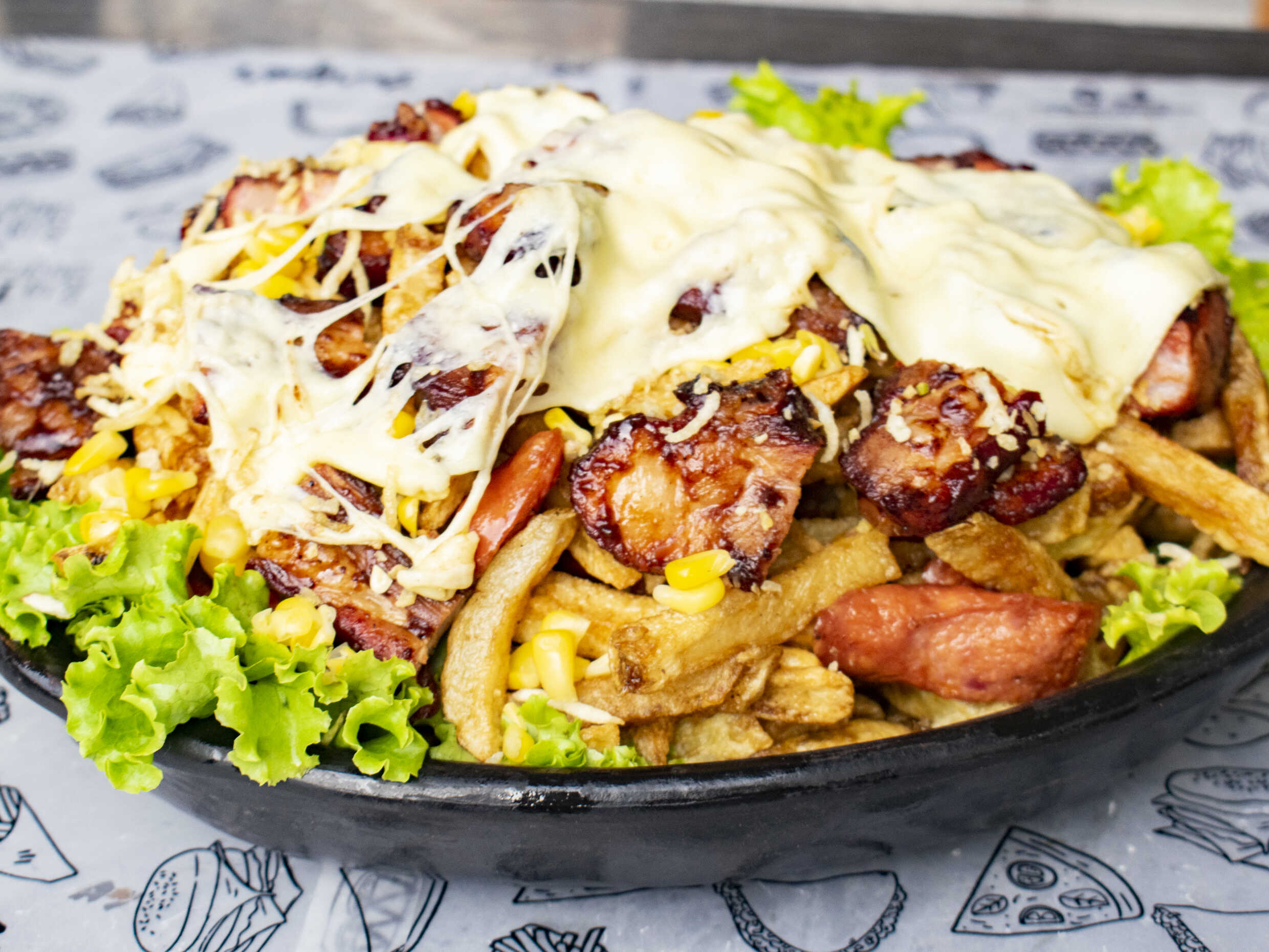 200 g De Pollo, 100 gr de salchicha, papas a la francesa, doble queso, maíz y salsas de la casa.