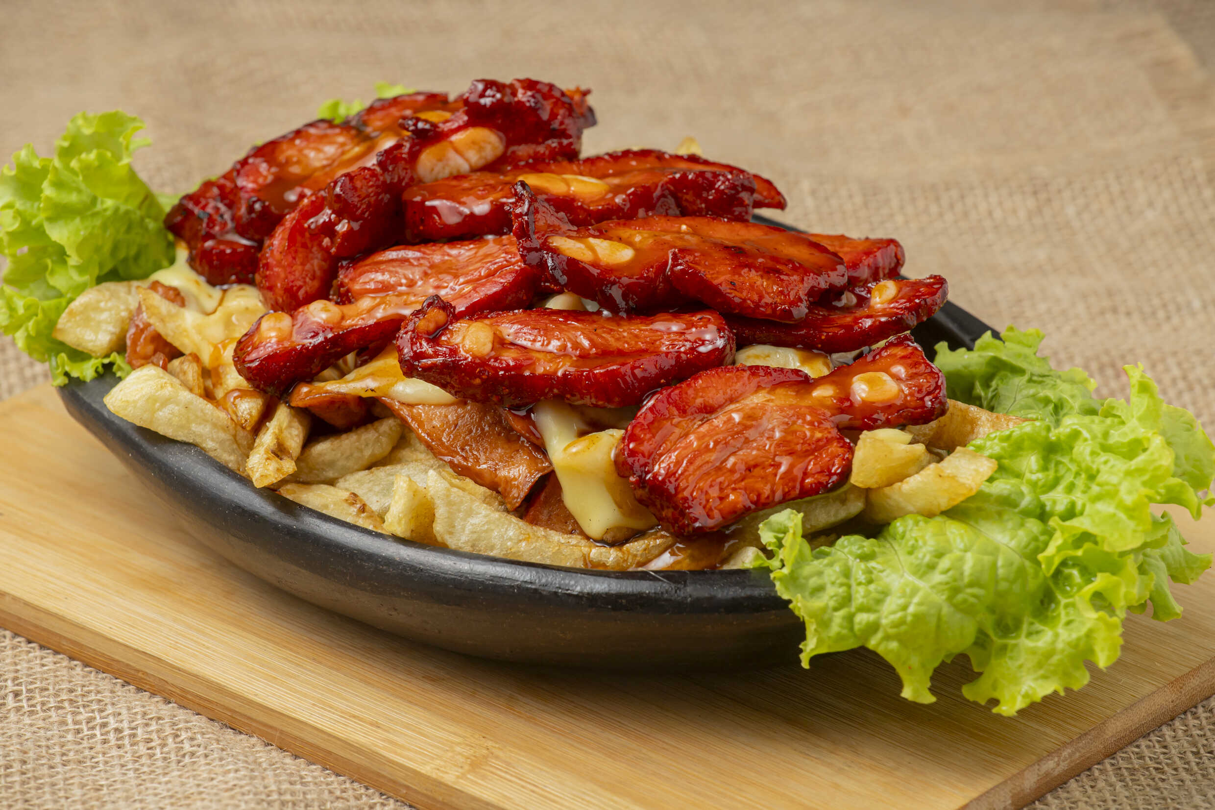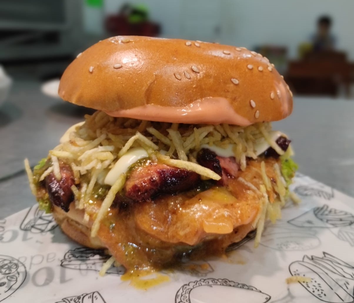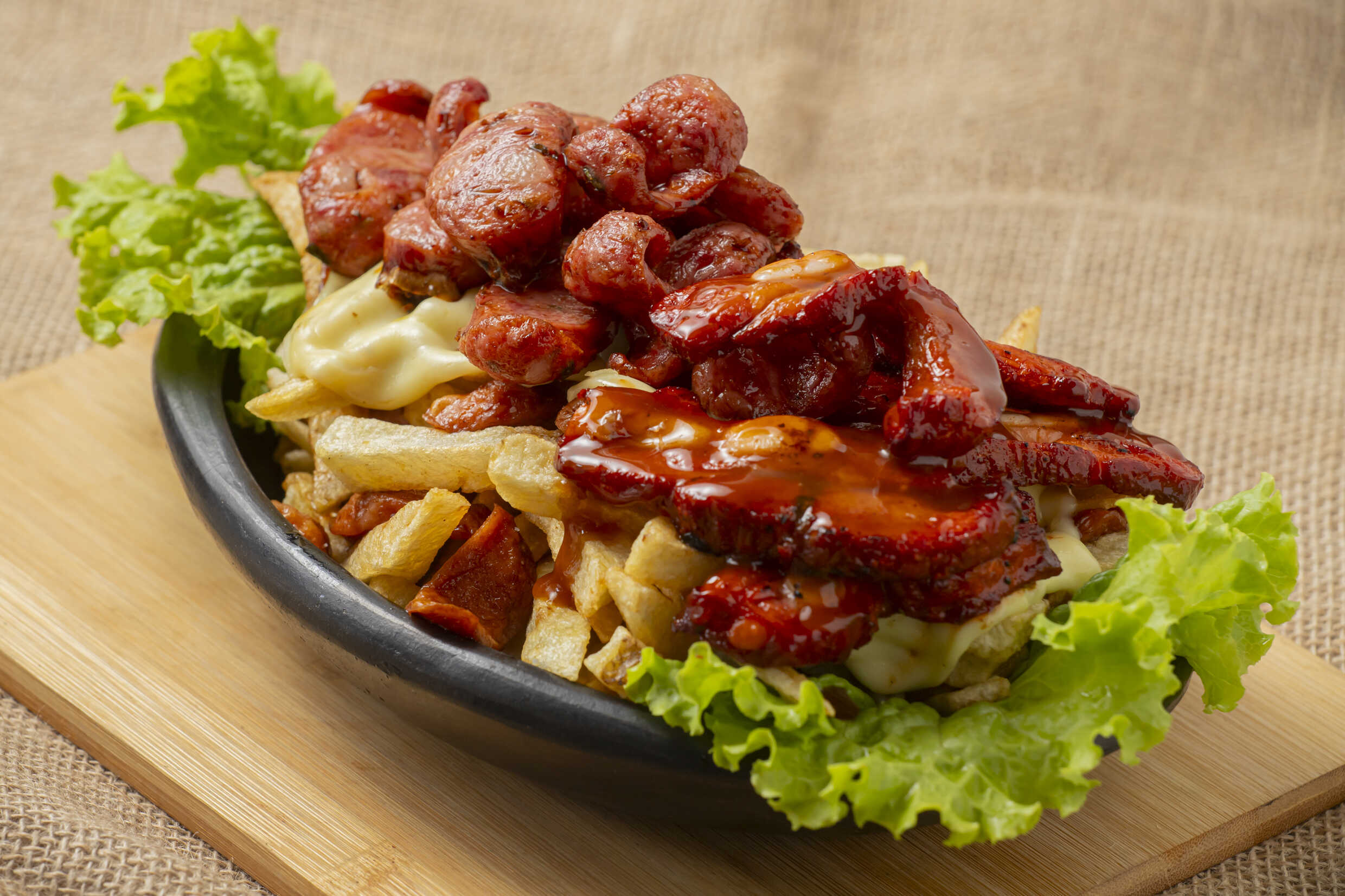 200 g De Pollo, 100 gr de salchicha, papas a la francesa, doble queso, maíz y salsas de la casa.