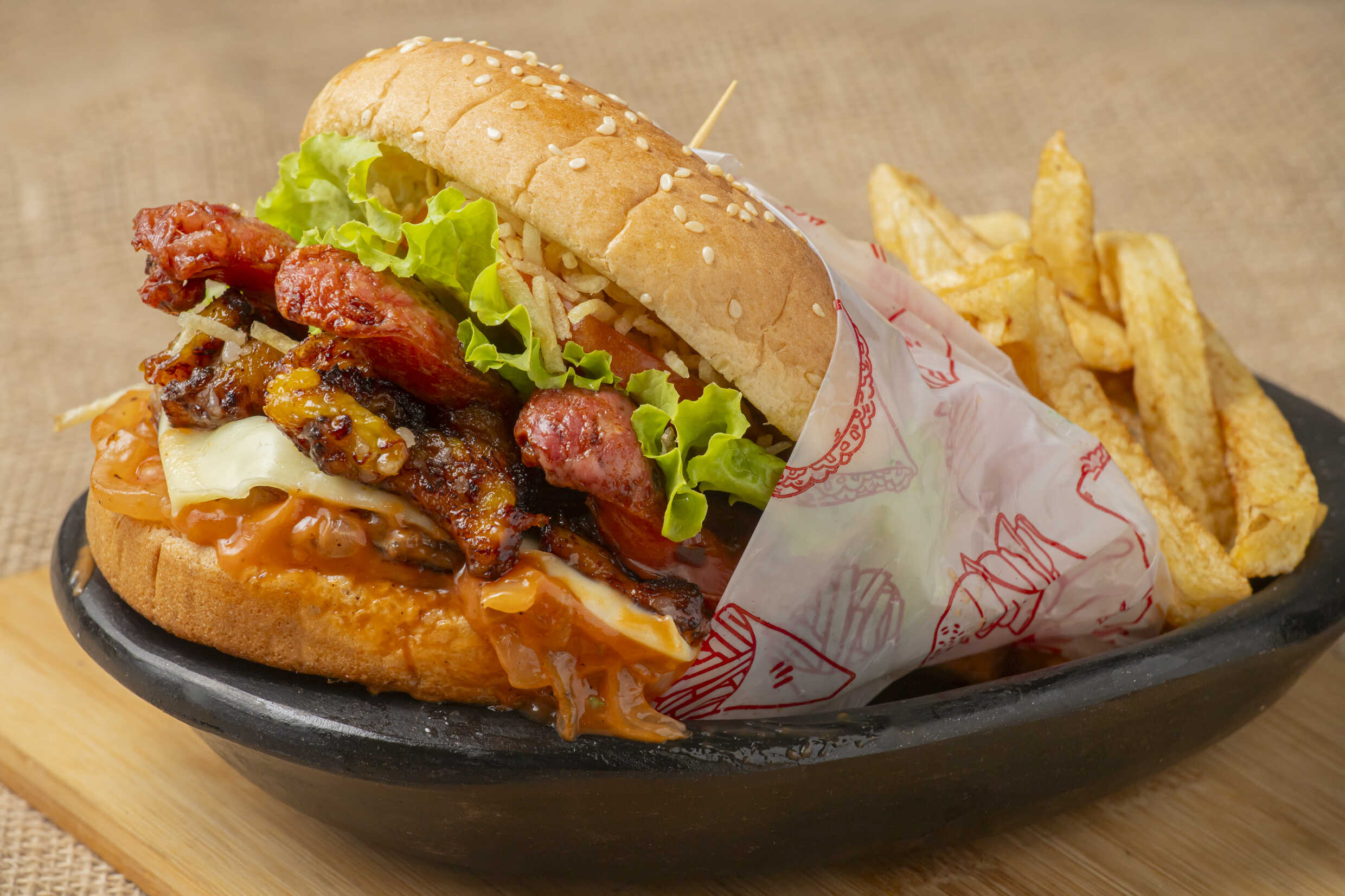 75 gr de chorizo, triple tocineta, maduro, queso, tomate, cebolla, ripio y salsas de la casa más porción de papas a la francesa.