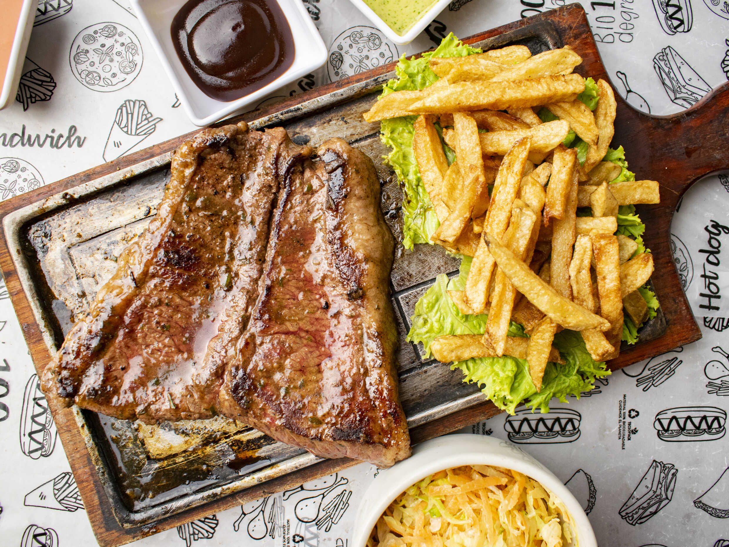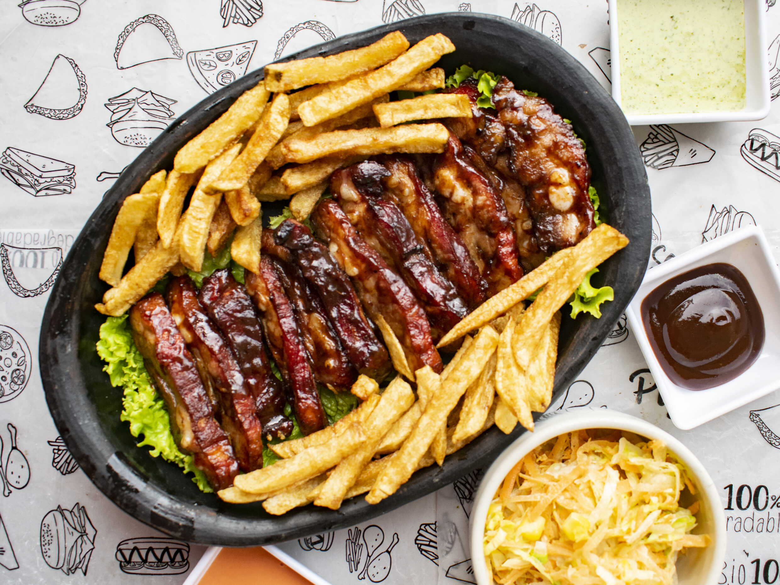 400 g De costilla, 200 g de carne llanera, acompañadas de doble porción de papas a la francesa.