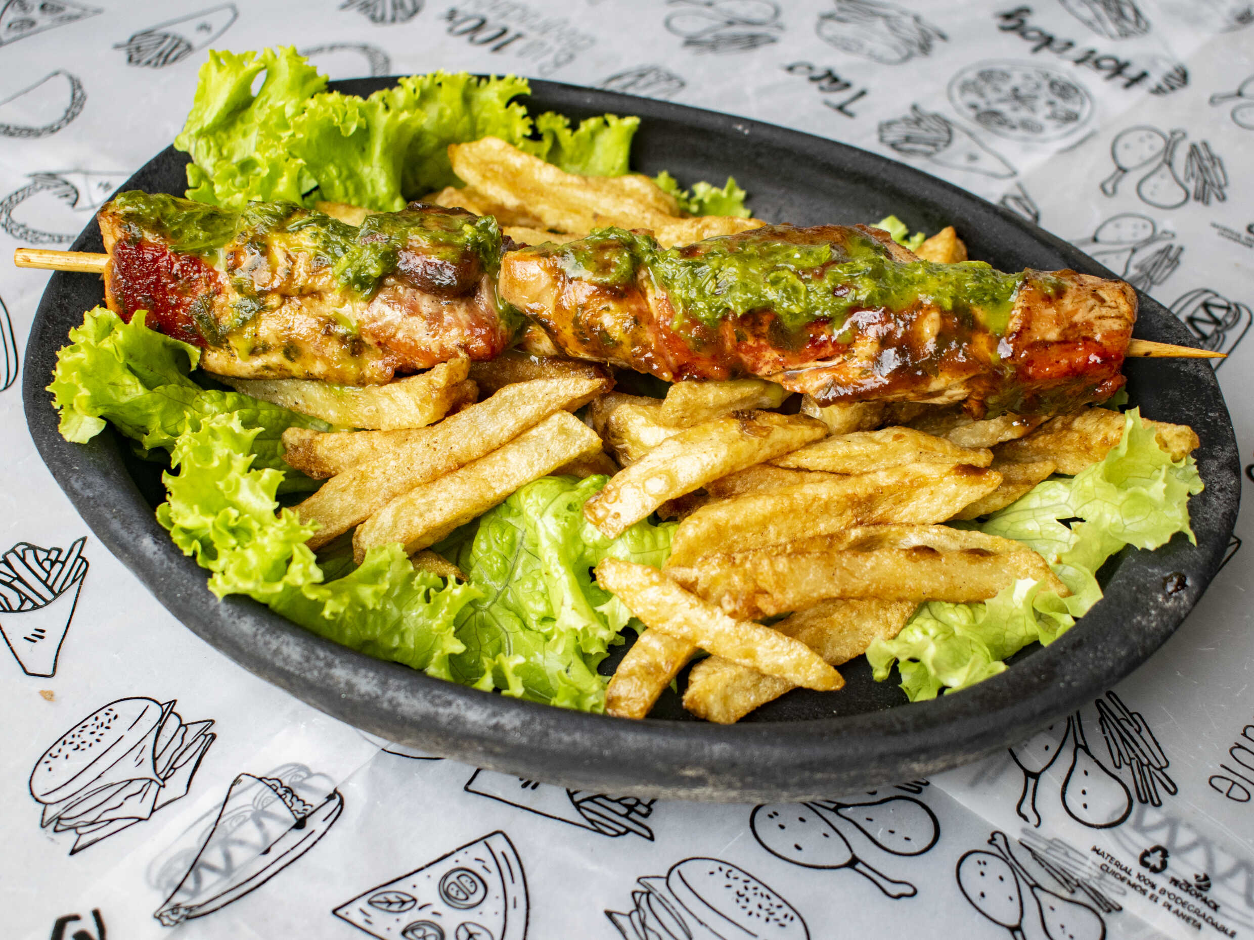 Chuzo de cerdo y pollo, acompañado de papas a la francesa.