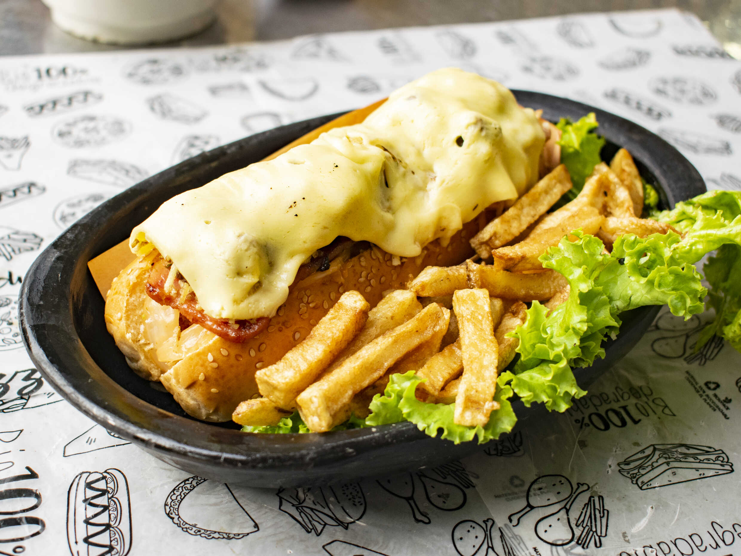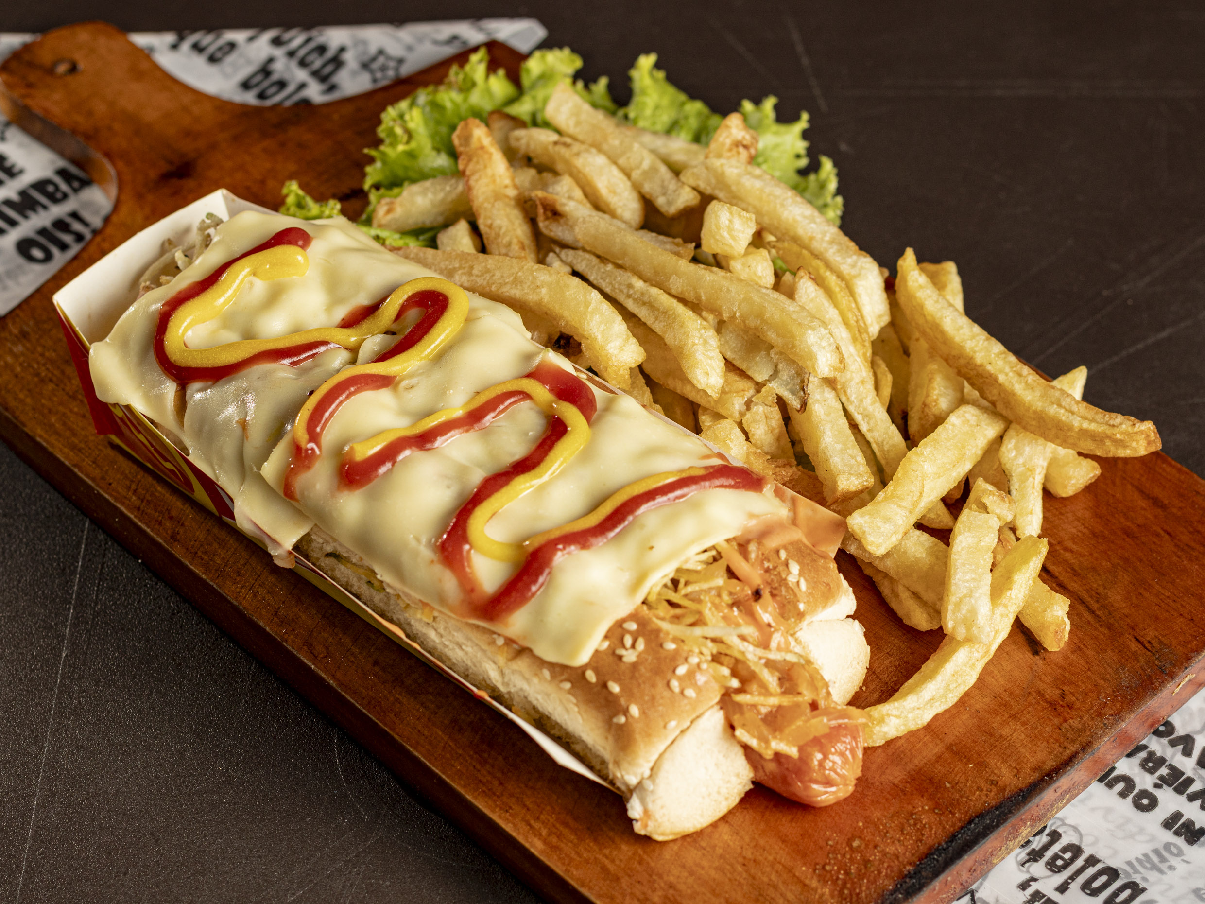 200 g de salchicha, doble porción de papas a la francesa, triple queso, maíz y salsas de la casa.