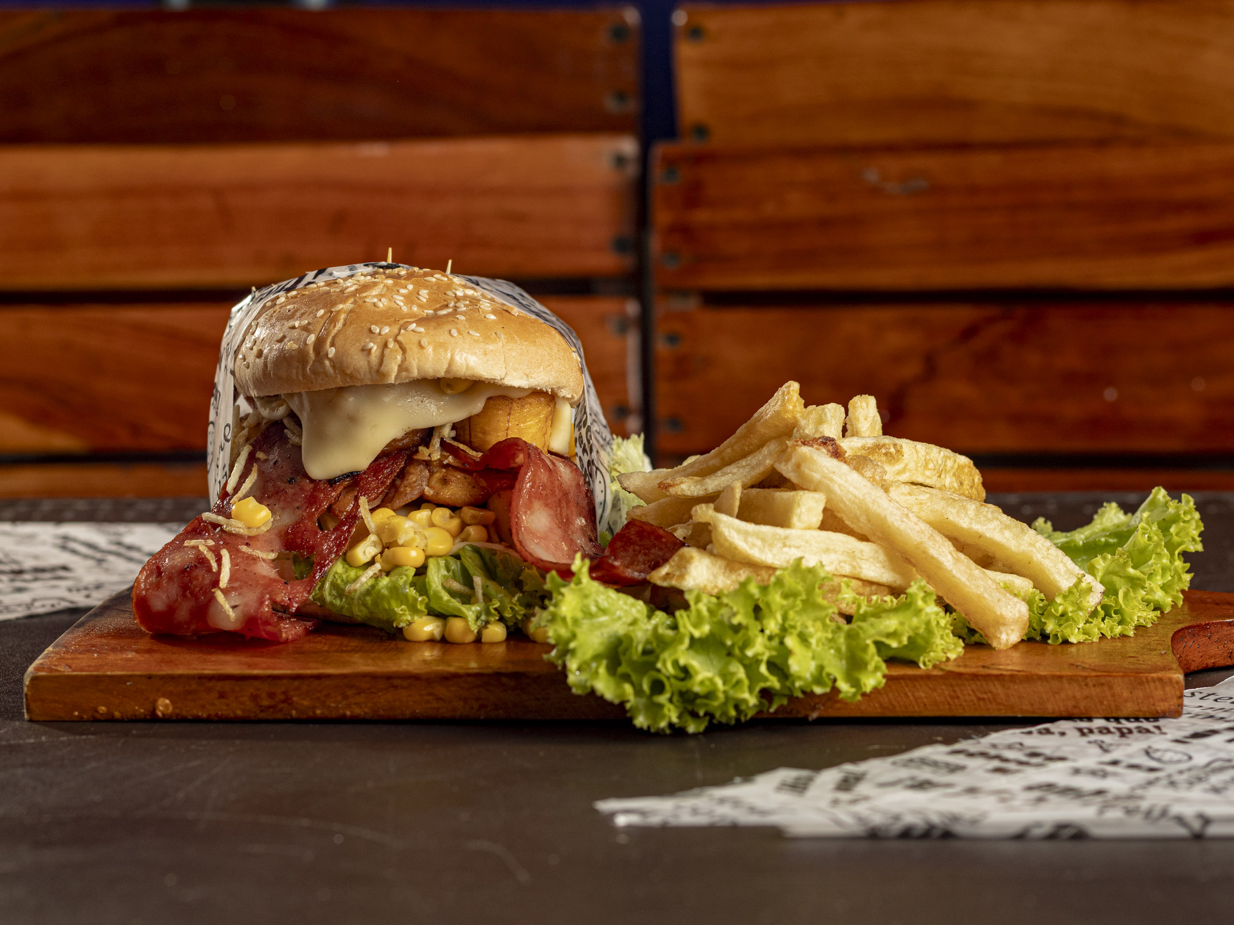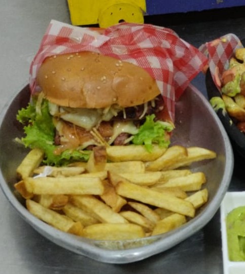2 carnes opcionales, tomate, pan, lechuga, queso, maduro, 2 tocinetas, ripio, cebolla, maiz y papas a la francesa.