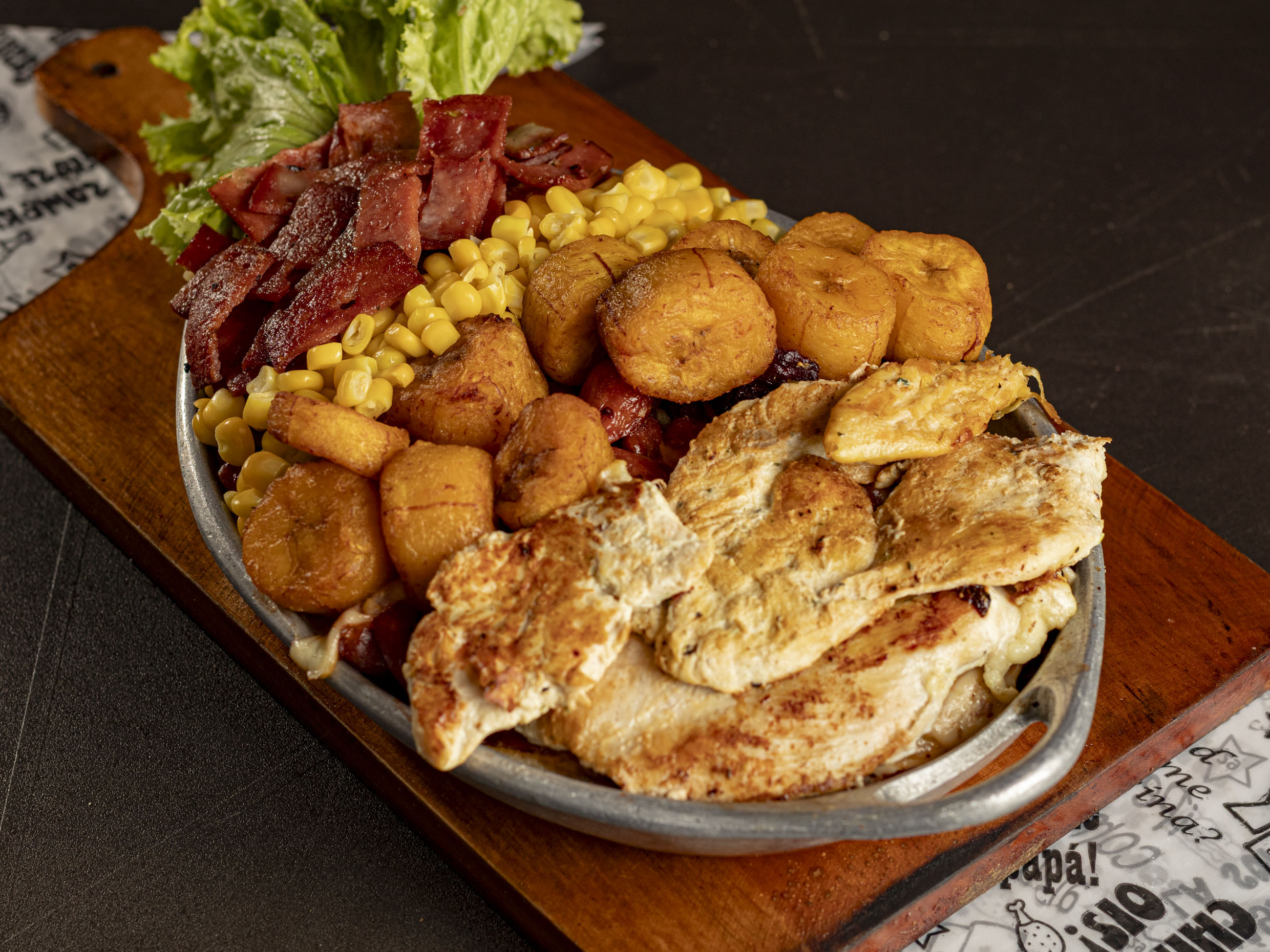 Salchi Maduro Mixta Para 2 Personas con 200gr de pollo, 50gr de costilla, 50gr de llanera, maiz, queso, tocineta, maduro, papas a la francesa y salsas.