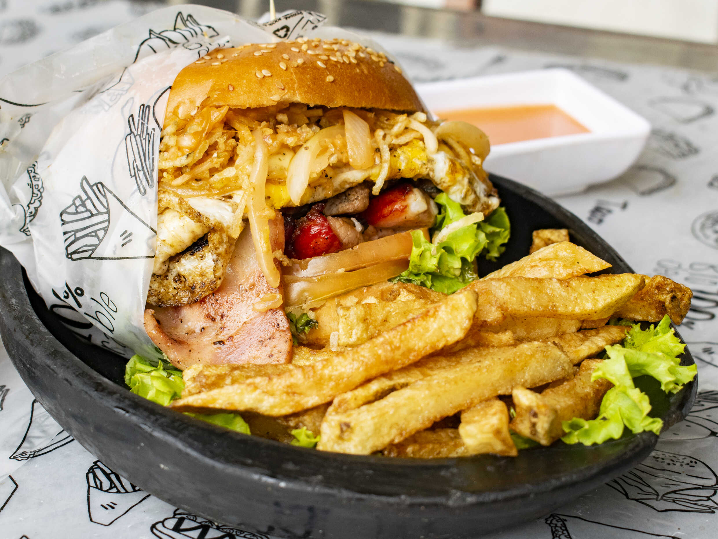 2 Carnes opcional entre (carne artesanal, pollo, llanera o costilla), lechuga, queso, tomate, cebolla, ripio, huevo, tocineta y salsas de la casa más porción de papas a la francesa.