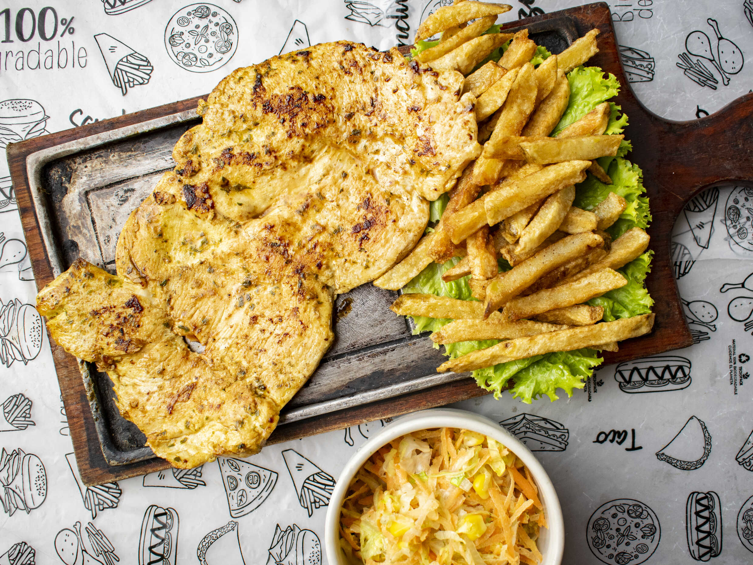 400 g De pollo, ensalada de lechuga y tomate, papas a la francesa.