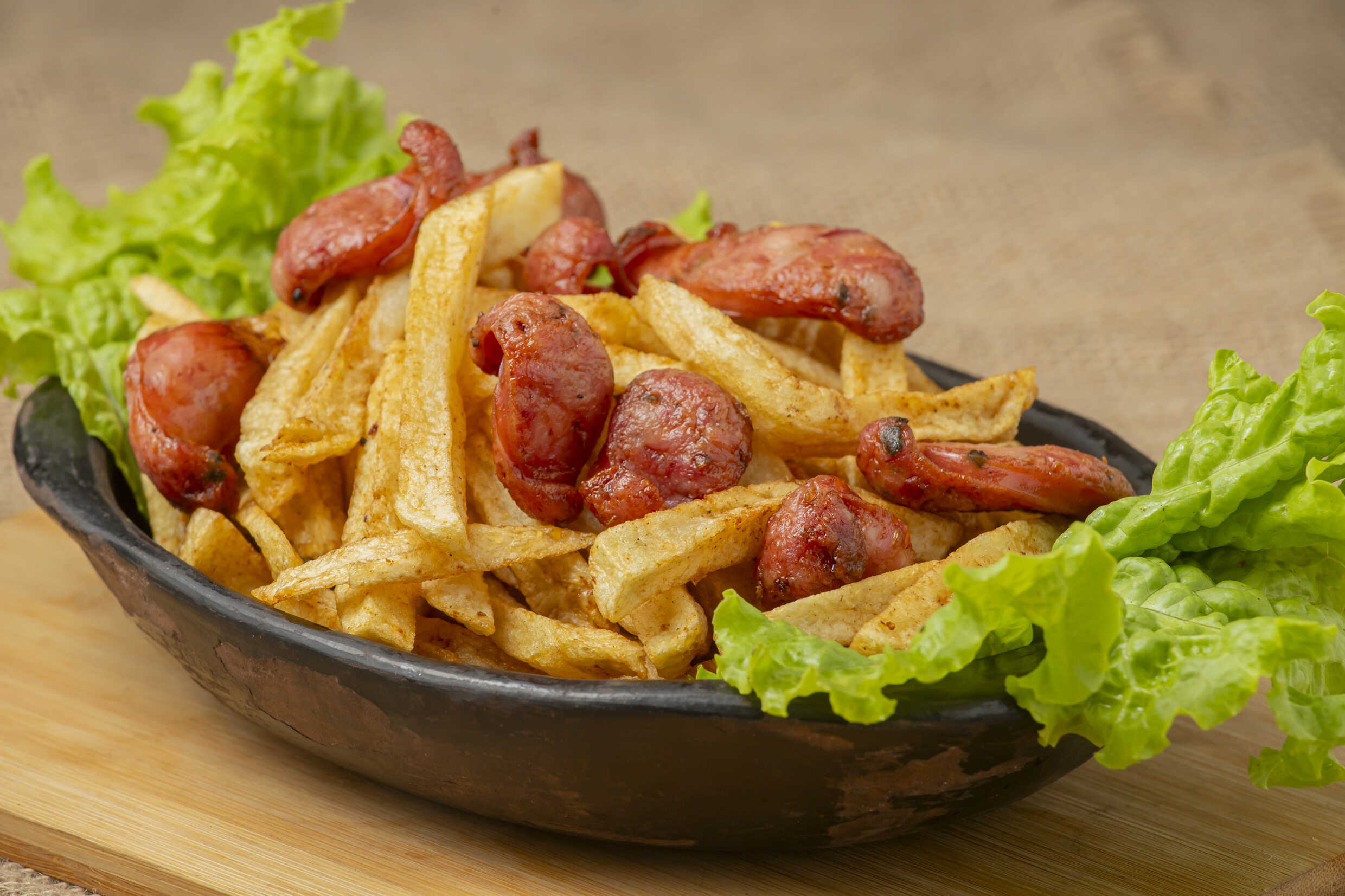 100 g De salchicha, papas a la francesa, queso y salsas de la casa.