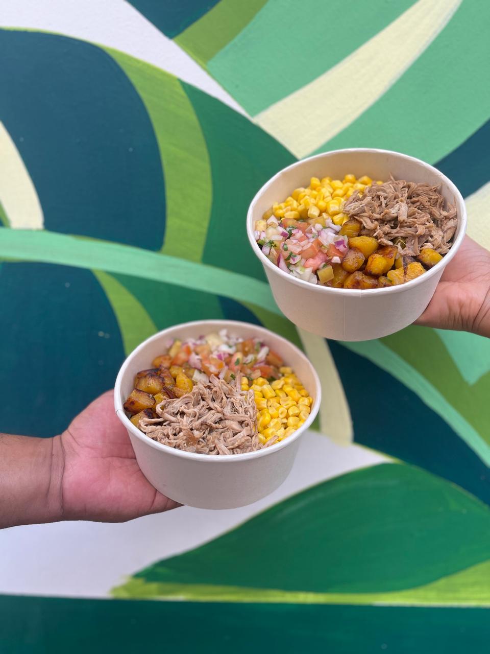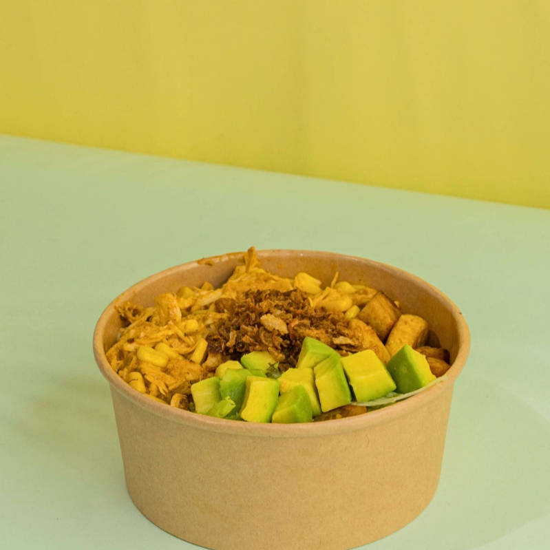 Base de arroz acompañado de pollo desmechado y maicitos en salsa chipotle, maduritos y ensalada con aguacate acompañado de jugo 9 onz