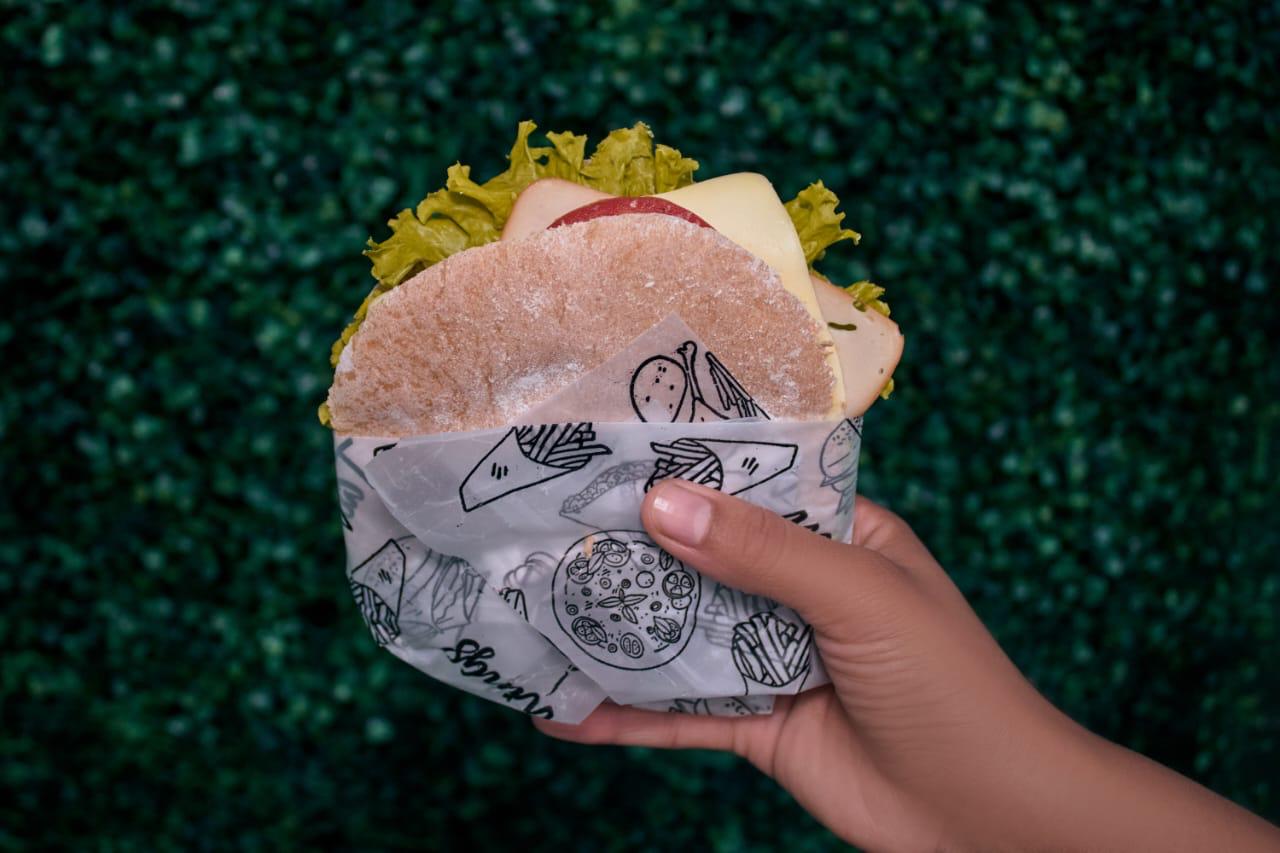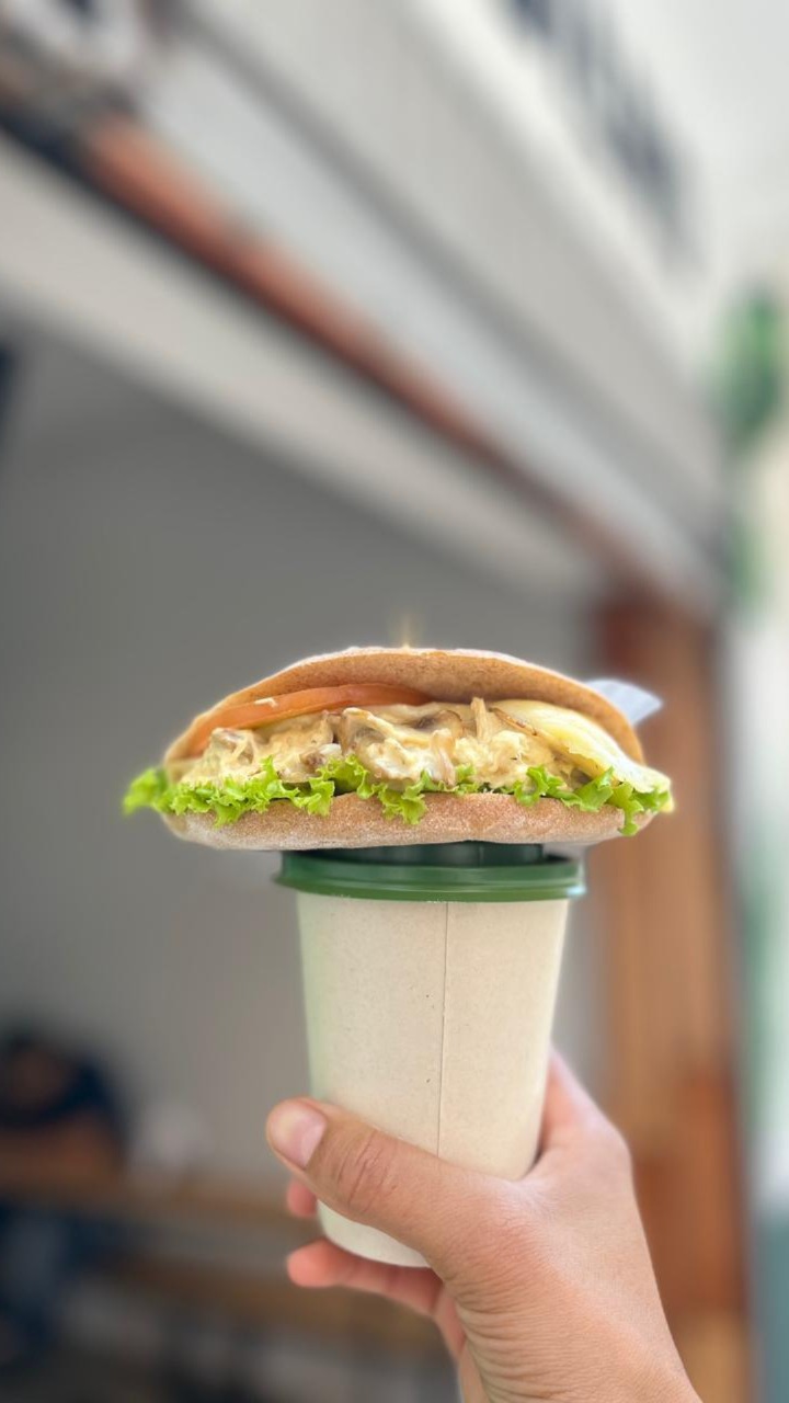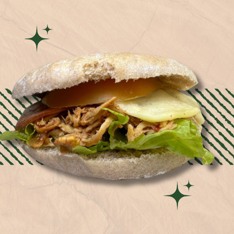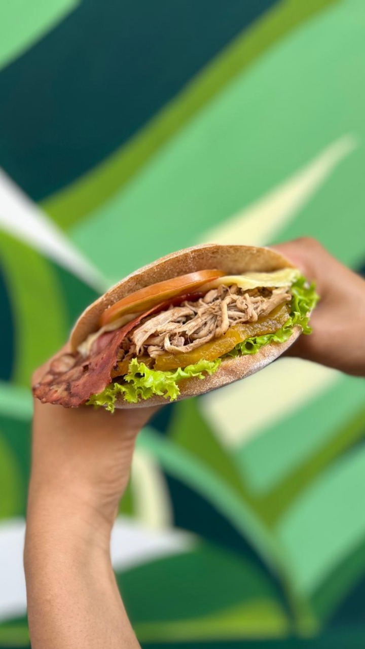 Sándwich con pan artesanal (hecho por nosotros mismos), lechuga, tomate, salsa de la casa (hecha por nosotros mismos, sin conservantes ni aceites), pollo desmechado, carne desmechada, aguacate y queso.