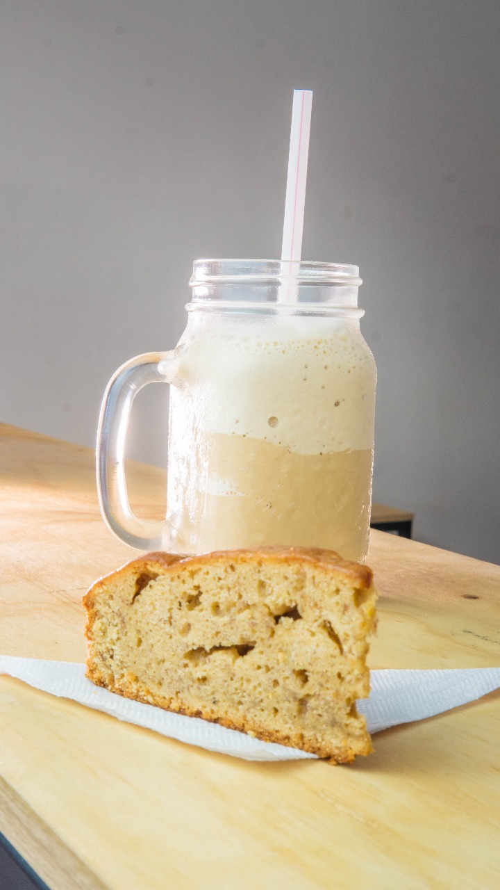 Escoge entre un granizado de milo o granizado de capuccino, acompañado de torta de banano.