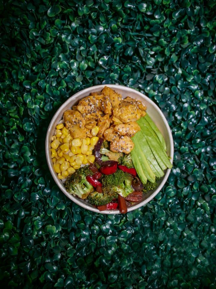 Base de arroz y lechuga acompañado de pollo a la naranja, maicitos, salteado de verduras y aguacate, acompañado de jugo 9 onz y fruta.