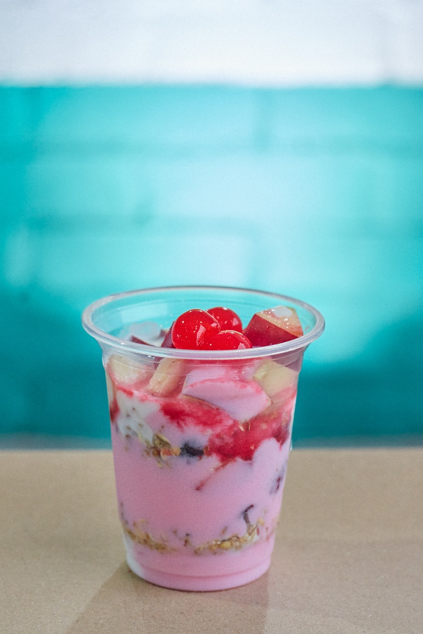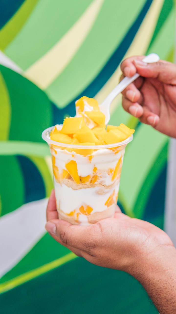 Parfait con Yogurt sin azucar, Mango fresco picado, Banano Y galleta tosh.