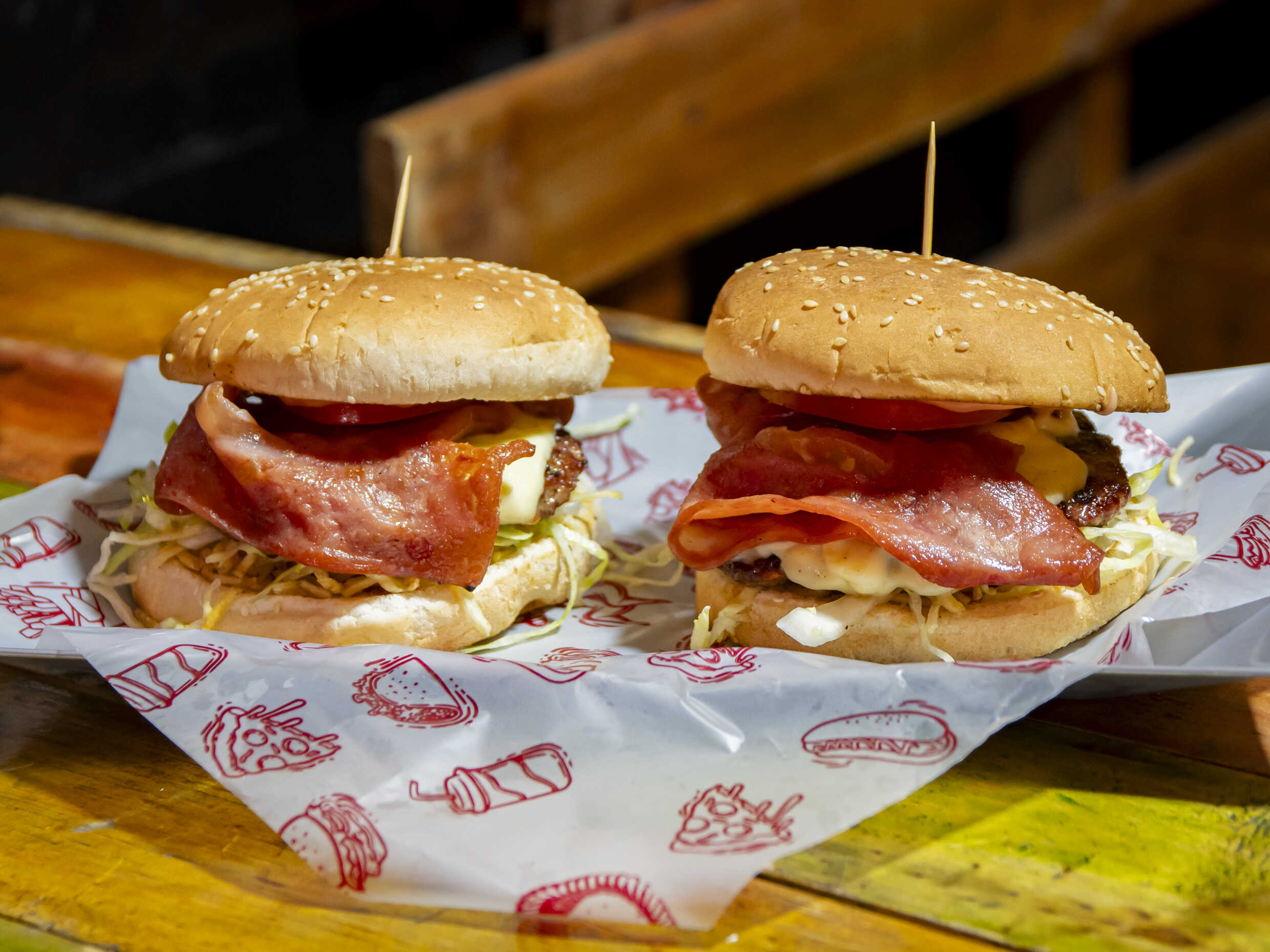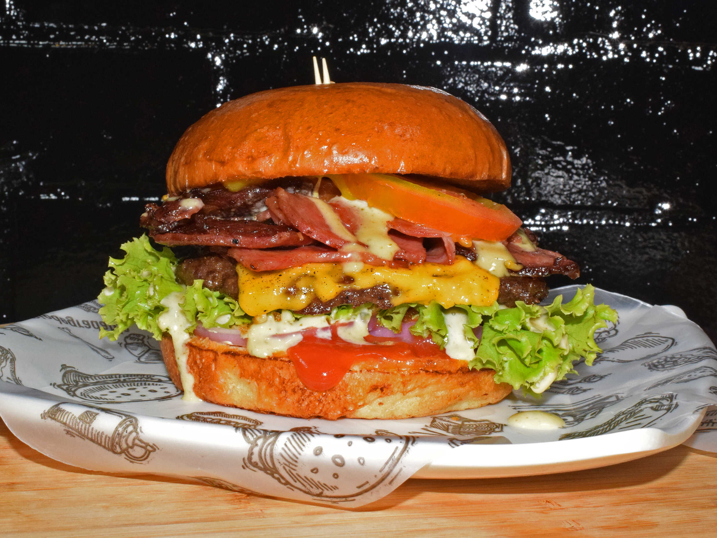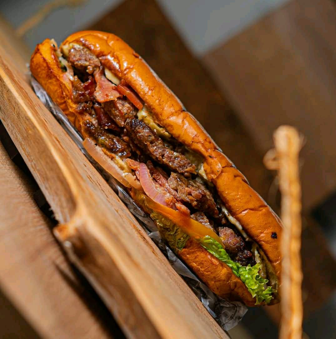 Pan brioche, doble carne, queso, cebolla, tomate, ripio, salsa de tomate, salsa de la casa, lechuga y mostaza.