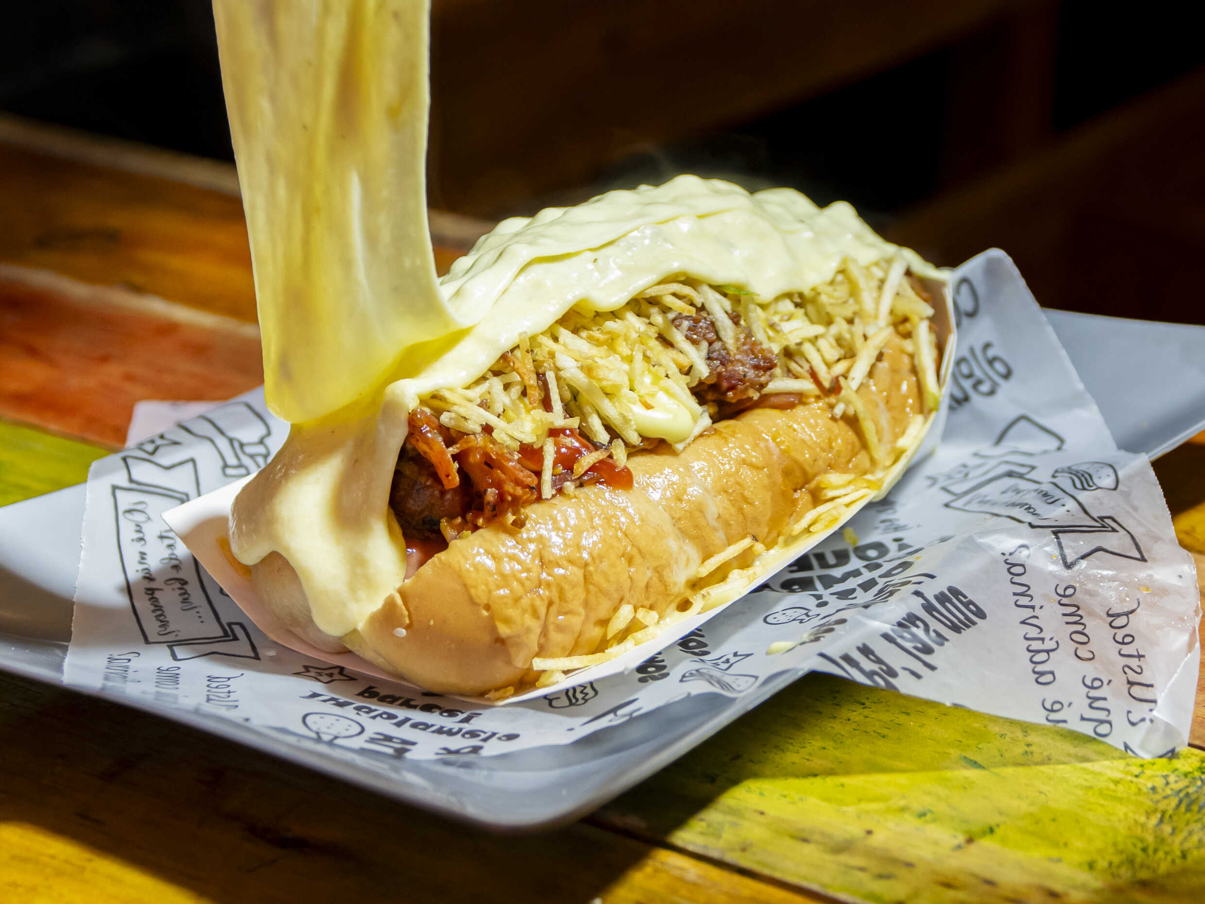 Pan perro, salchicha americana, tocineta, queso, ripio, cebolla, salsa de tomate, salsa rosada, salsa de piña y salsa showy.
