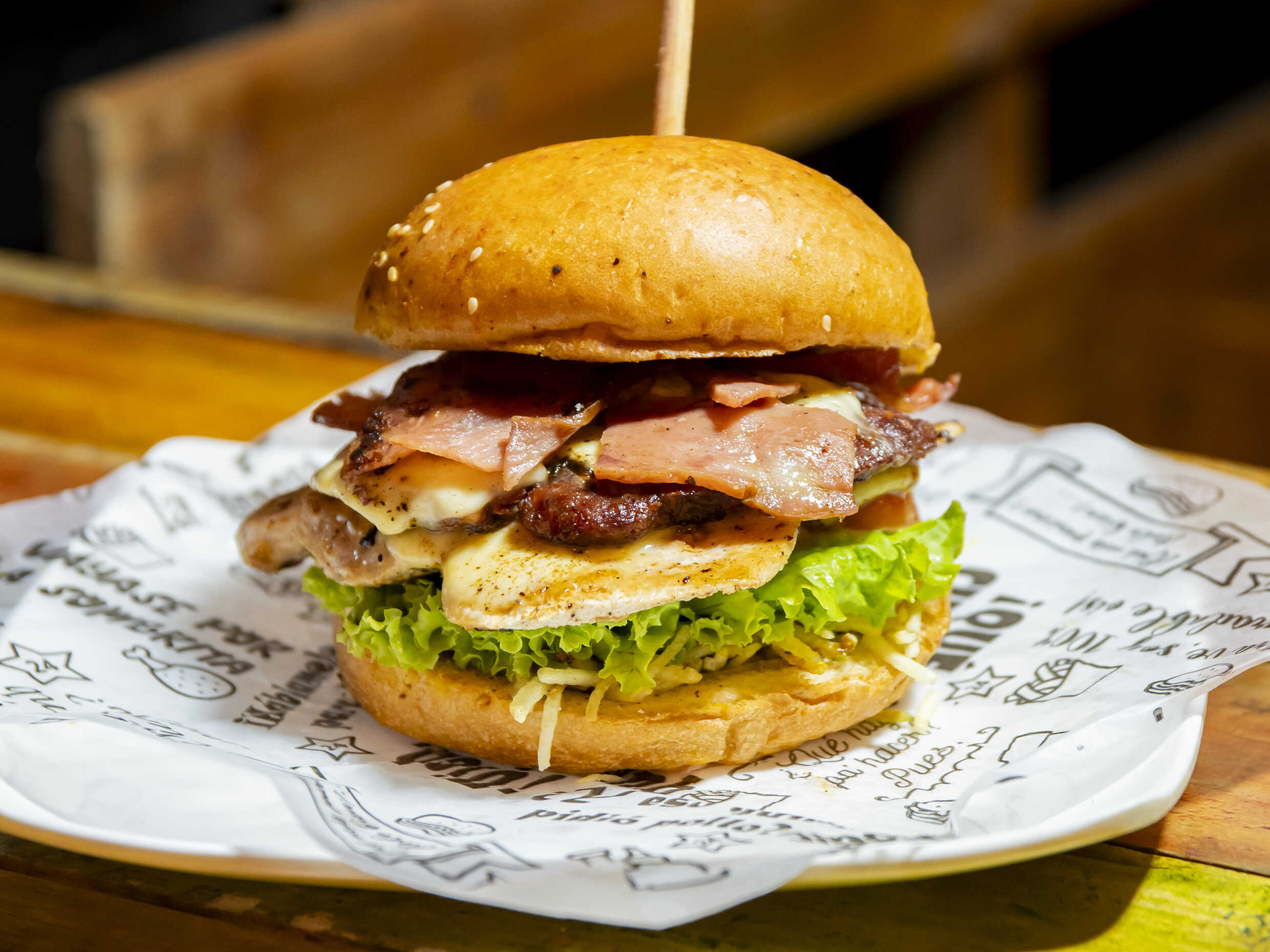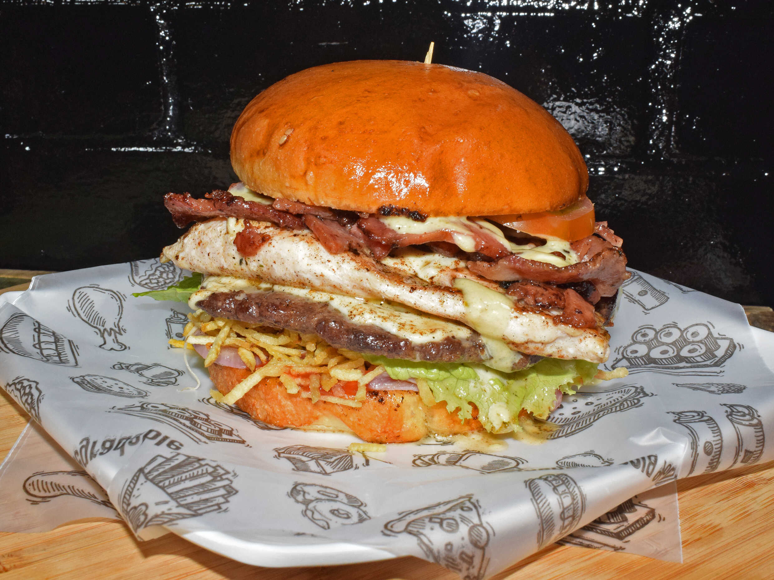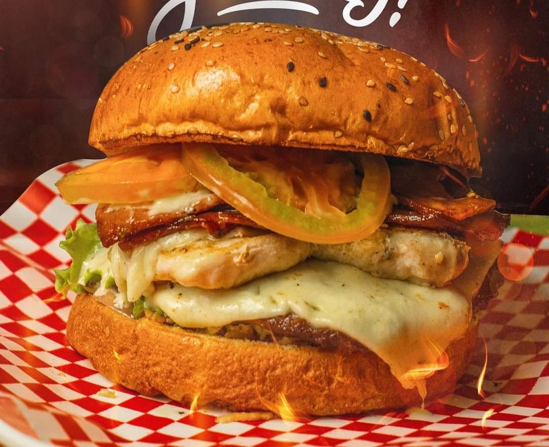 Pan brioche, filete de pollo, carne burguer, queso tocineta, lechuga, tomate, salsa de la casa, salsa de tomate, cebolla, mostaza y ripio.