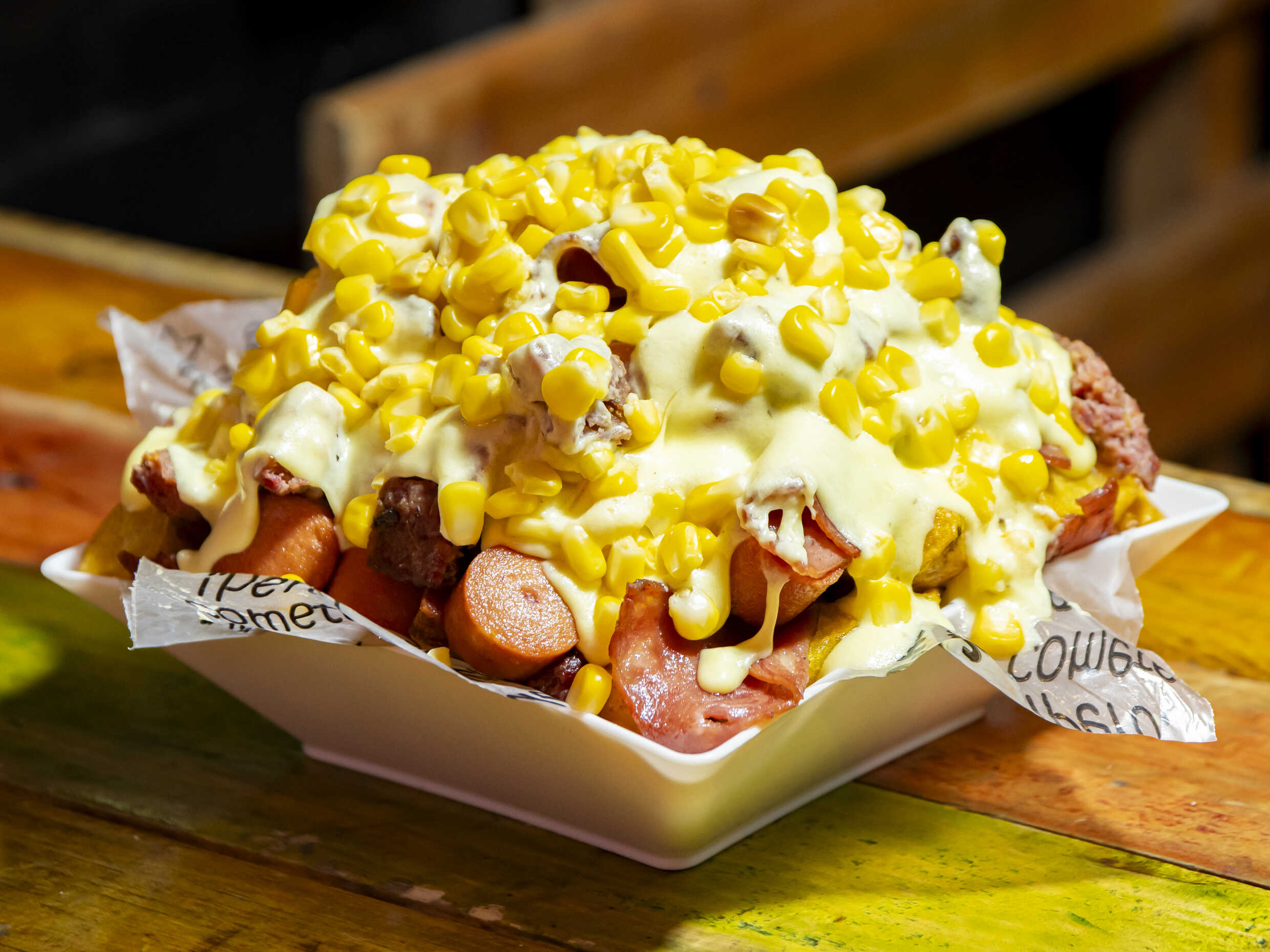 Papa amarilla, salchicha ranchera, tocineta, maíz tierno, queso gratinado, salsa de tomate, salsa rosada, salsa piña y salsa showy.