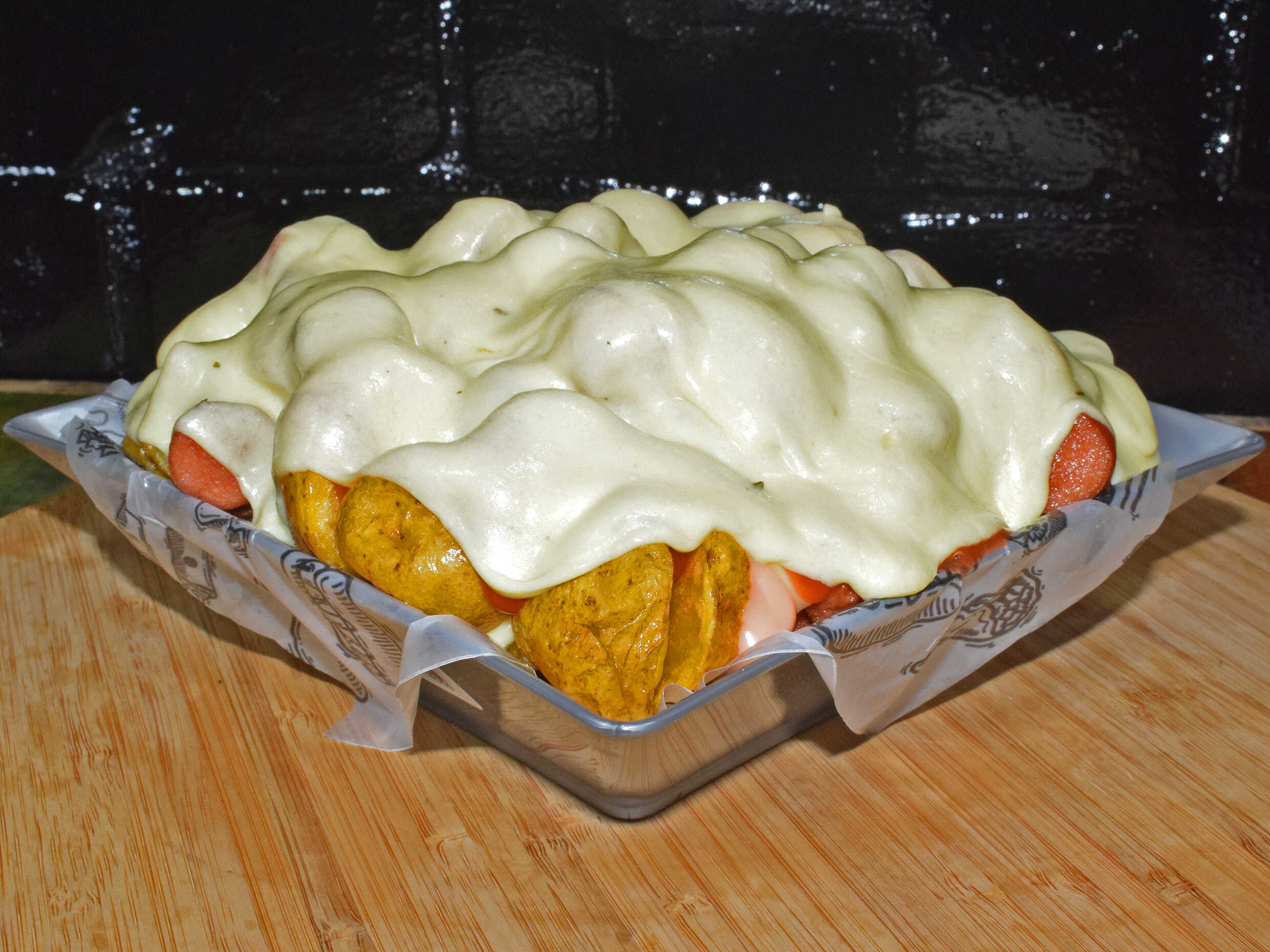Papa amarilla, tocino, salchicha, queso gratinado, salsa de tomate, salsa rosada, salsa piña y salsa showy.