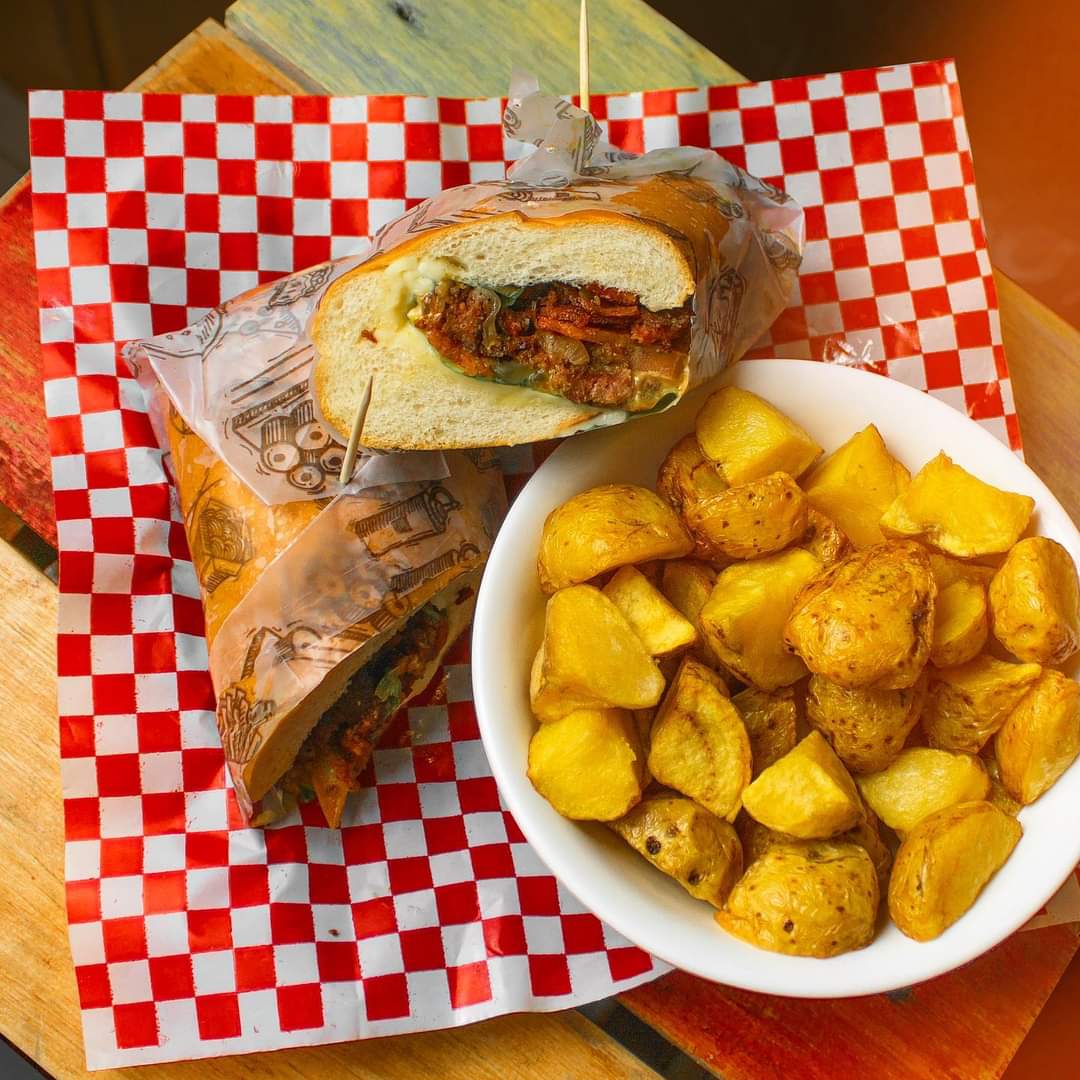 Pan brioche, doble carne, tocineta, cebolla, cávanos, queso gratinado, queso lonchas, ripio, tomate, lechuga, cerdo picado, salsa de tomate, mostaza, salsa de la casa y showy.
