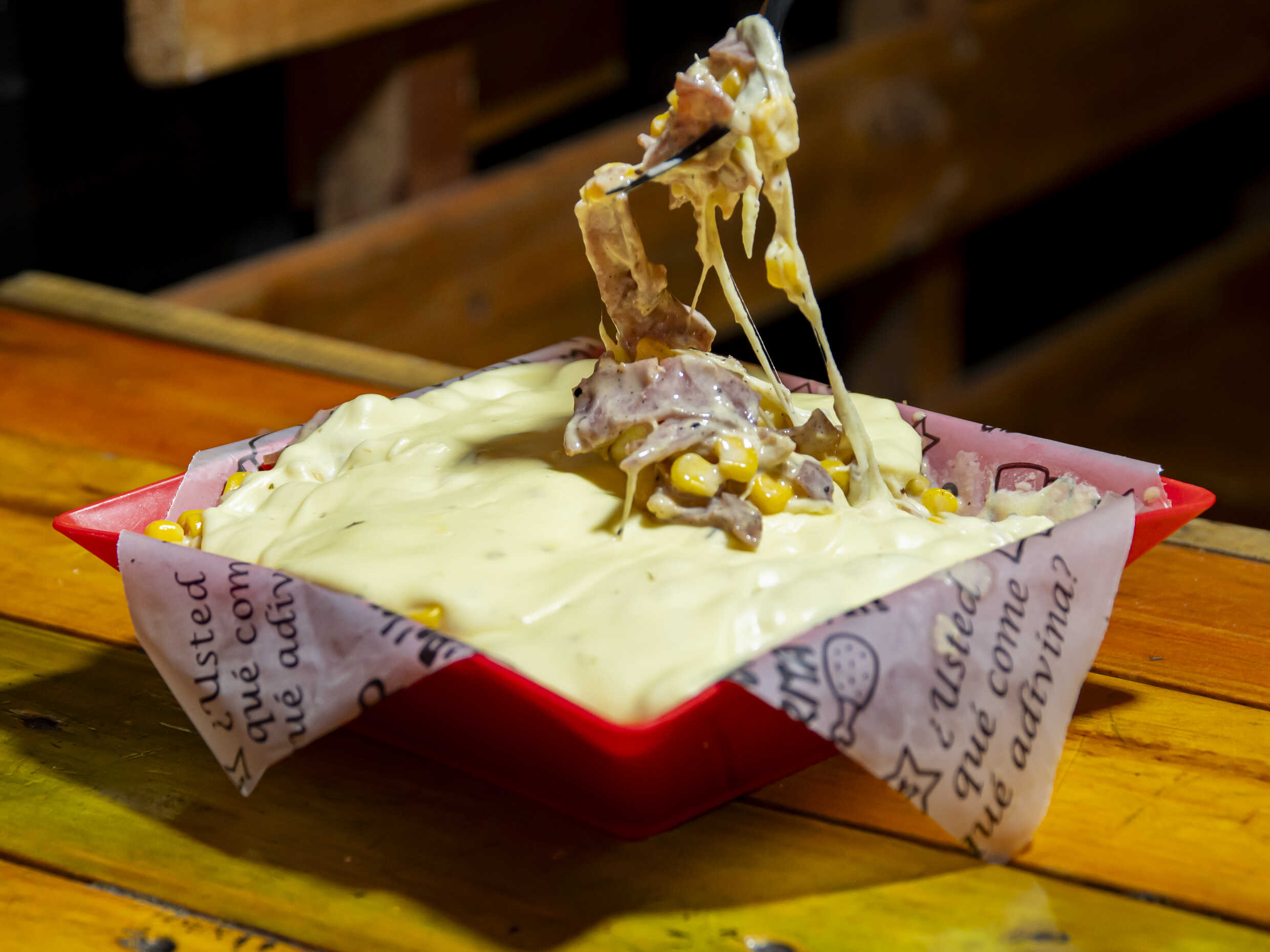 Maíz tienro, queso, tocino, pollo desmechado y salsa.