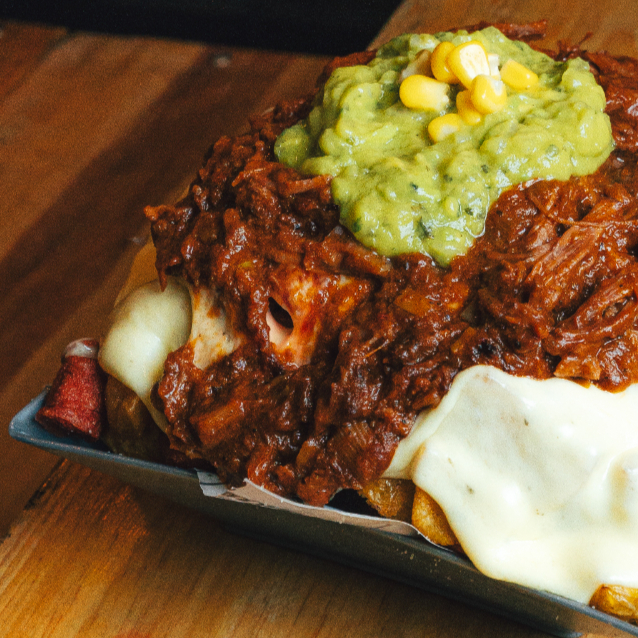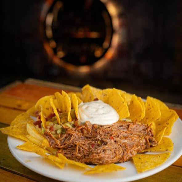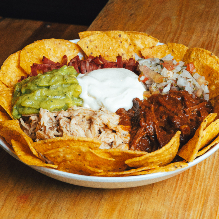 Totopos (Nachos) - Carne Desmechada - Queso Gratinado - Francesa - Guacamole - Queso Cheddar - Crema Agria - Pico de Gallo - Maiz