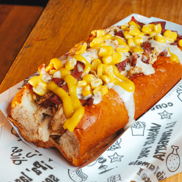 Pan perro, salchiperro, pollo desmechado, queso gratinado, tocino, salsa de tomate, salsa rosada, salsa de la casa, mostaza, cebolla, ripio y maíz tierno.