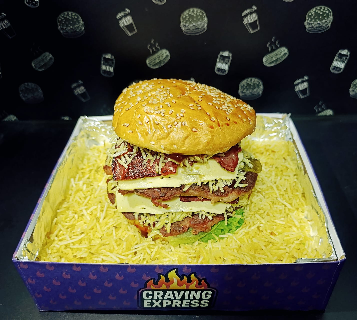 Doble carne de hamburguesa de res, tocineta, queso, pan hamburguesa, lechuga, tomate, ripio y salsas.
