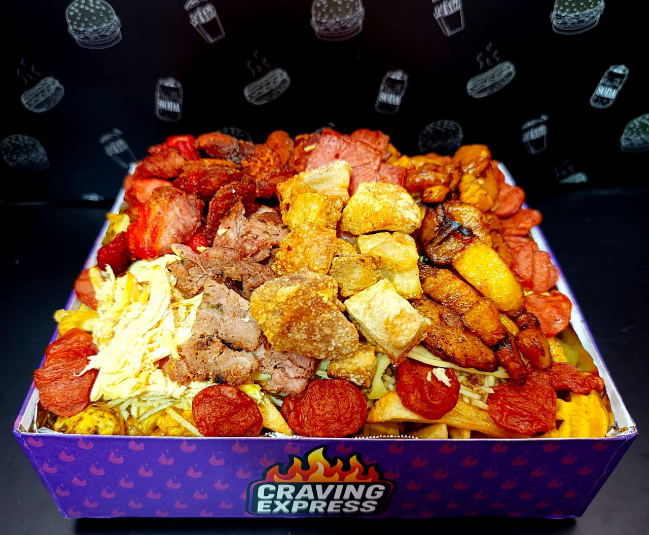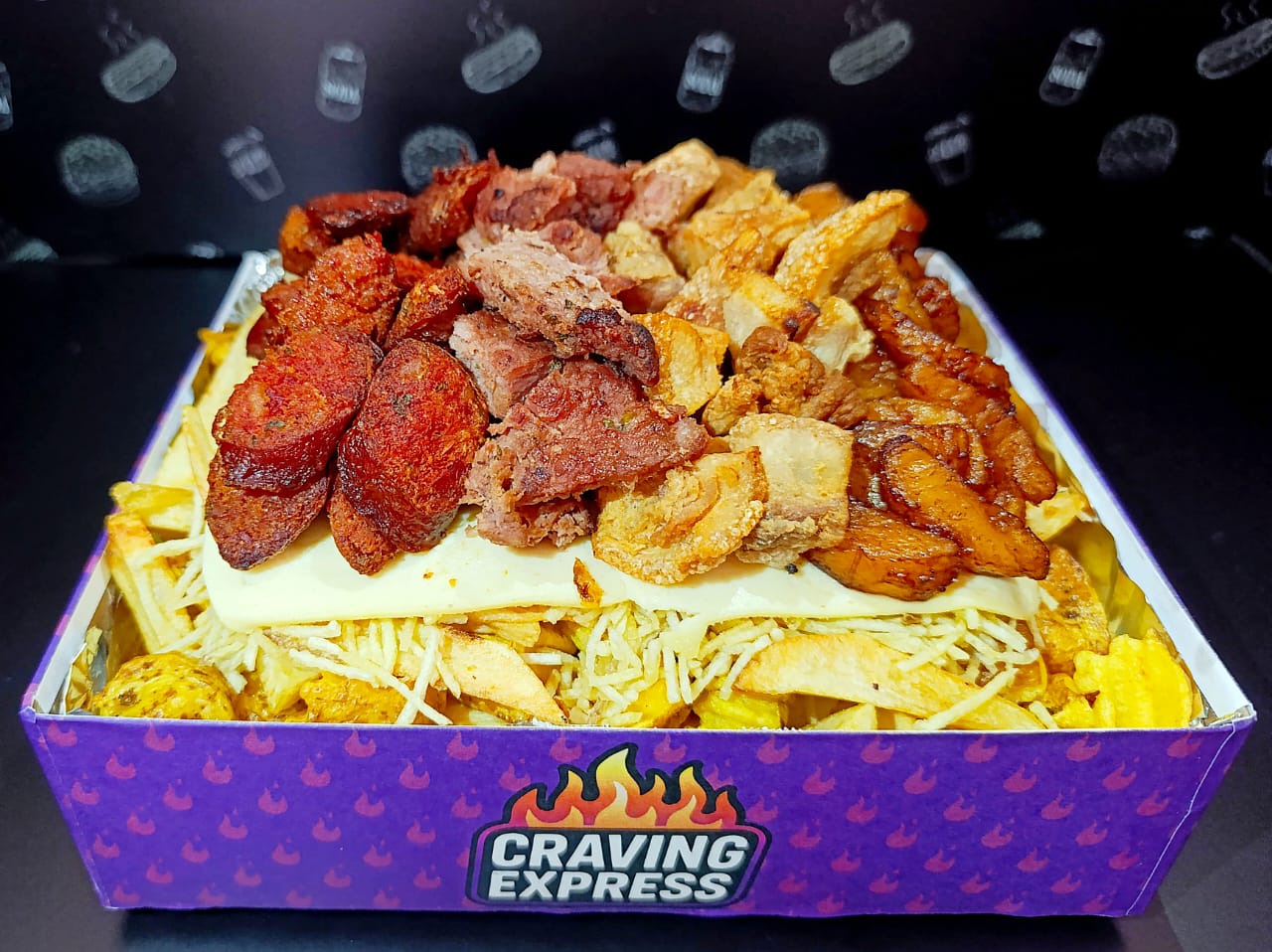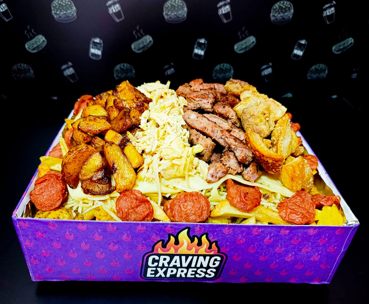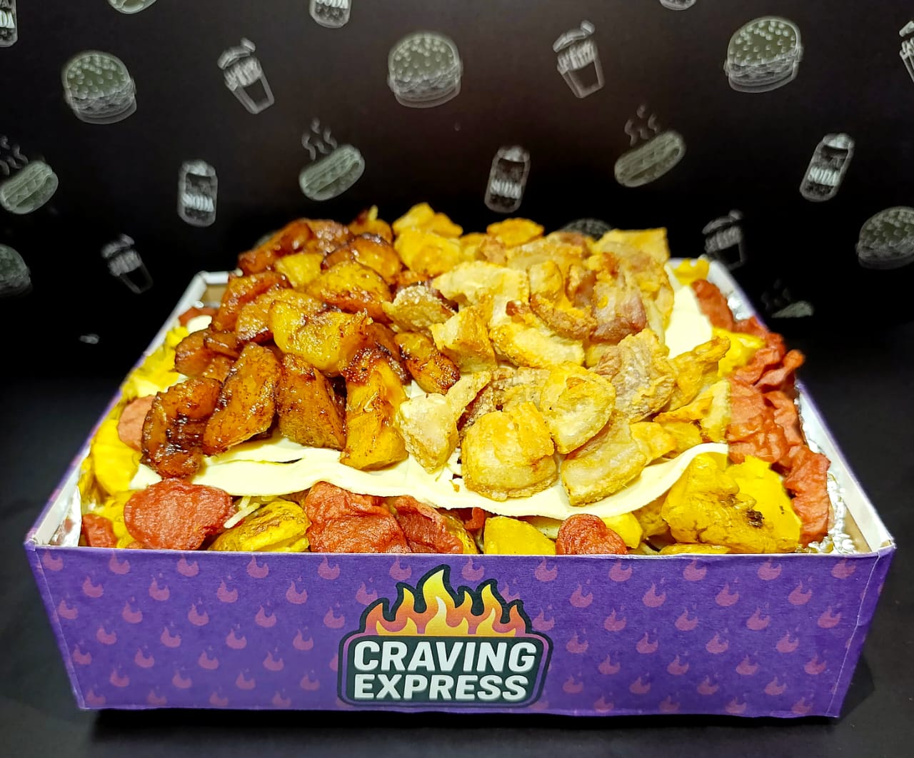 Salchipapa Porking (2‑3 personas, aprox. 700 g): Papas amarilla, papas a la francesa o combinadas; salchicha, ripio, queso, tocineta, chicharrón, costilla y salsas al gusto.