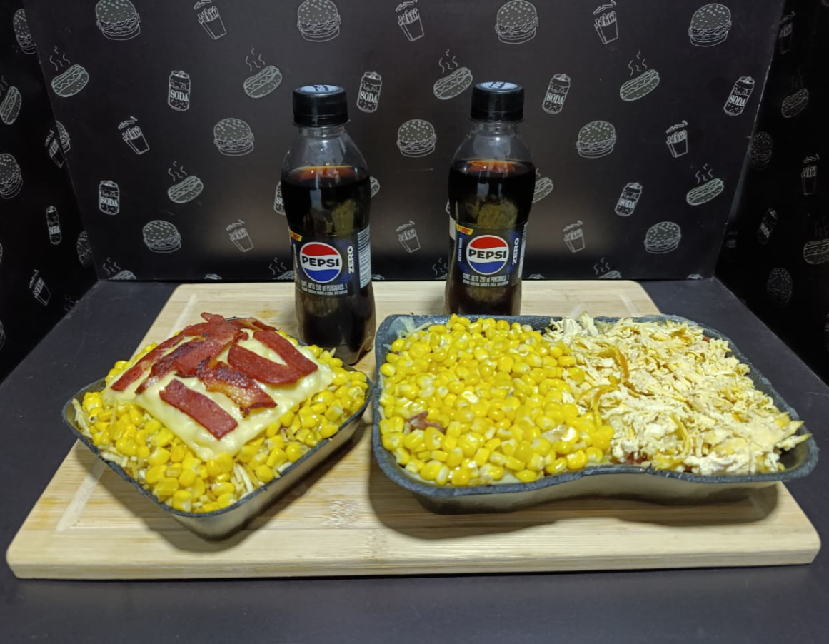 Maíz y Pollo (maíz, pollo, papa amarilla, queso, ripio y salsas) + Desgranado personal (maíz, pollo, queso, ripio y salsas) + 2 Gaseosas 250 ml