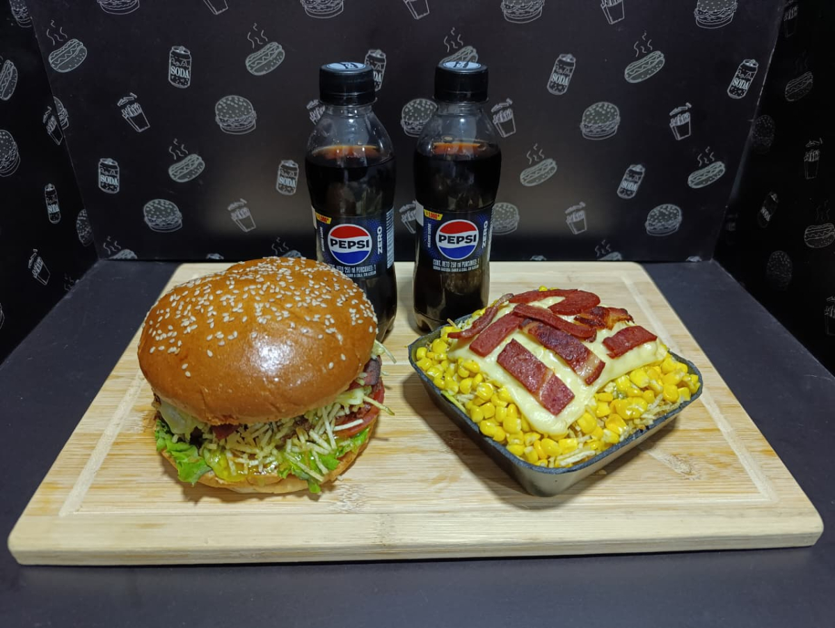 Hamburguesa Especial (pan, carne, tocineta, queso, tomate, lechuga, ripio y salsas) + Desgranado personal (maíz, pollo, queso, ripio y salsas) + 2 Gaseosas 250 ml