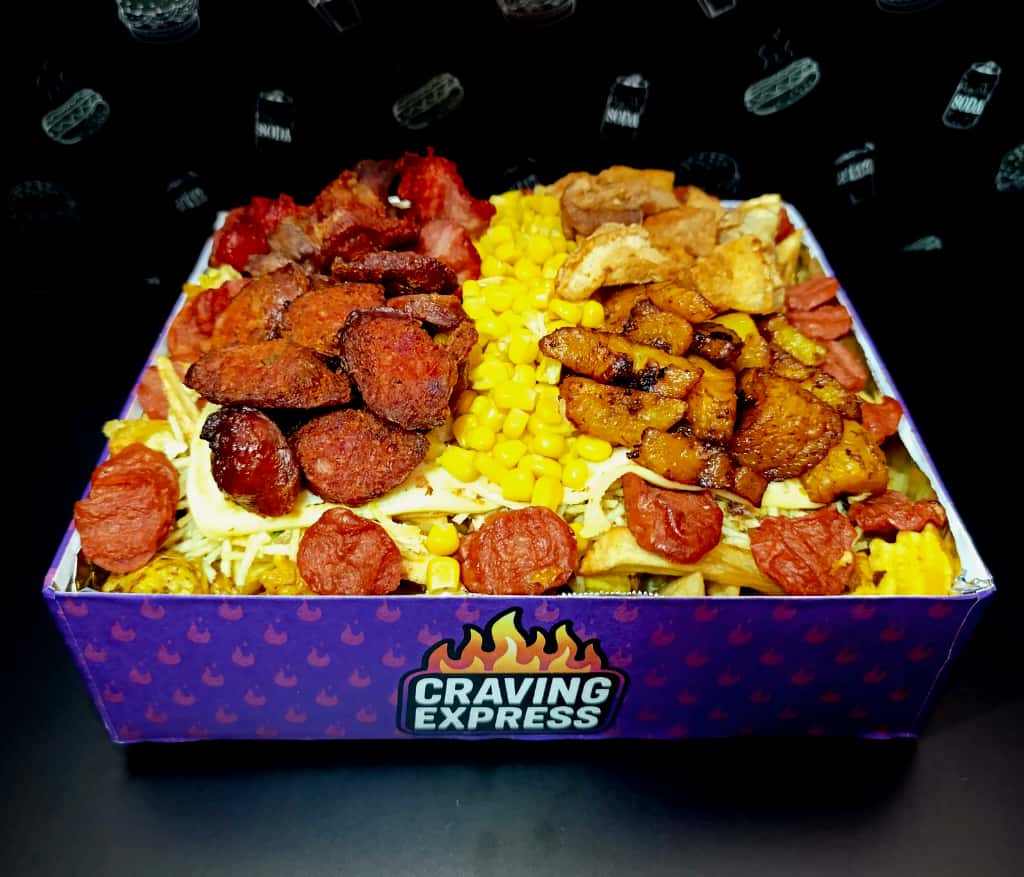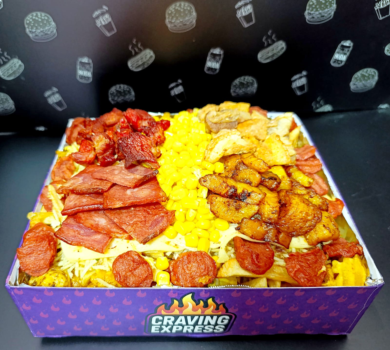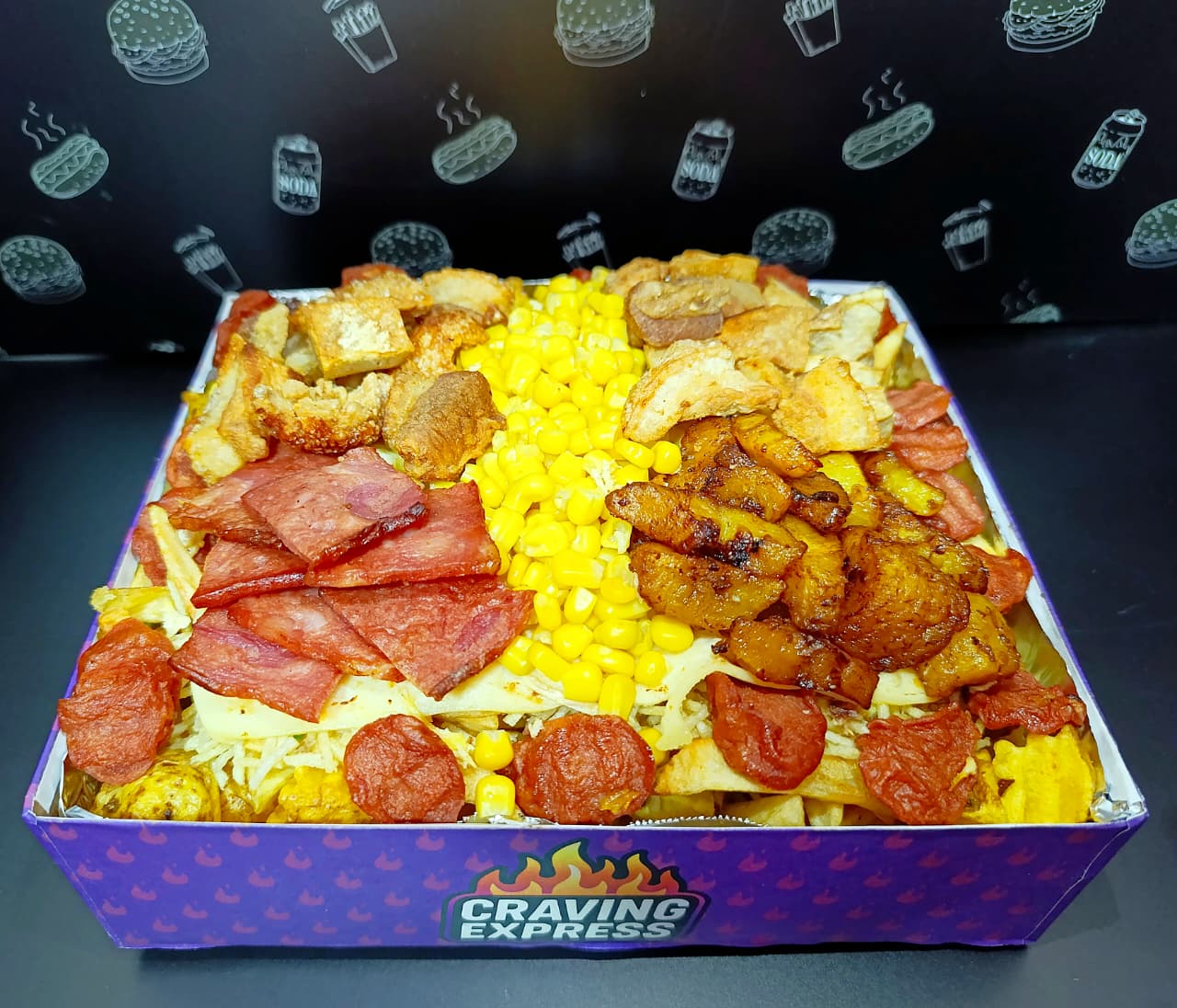 Pollo, tocineta, maíz tierno, queso doble crema, papas ripio y salsas de la casa: ajo, BBQ y piña.