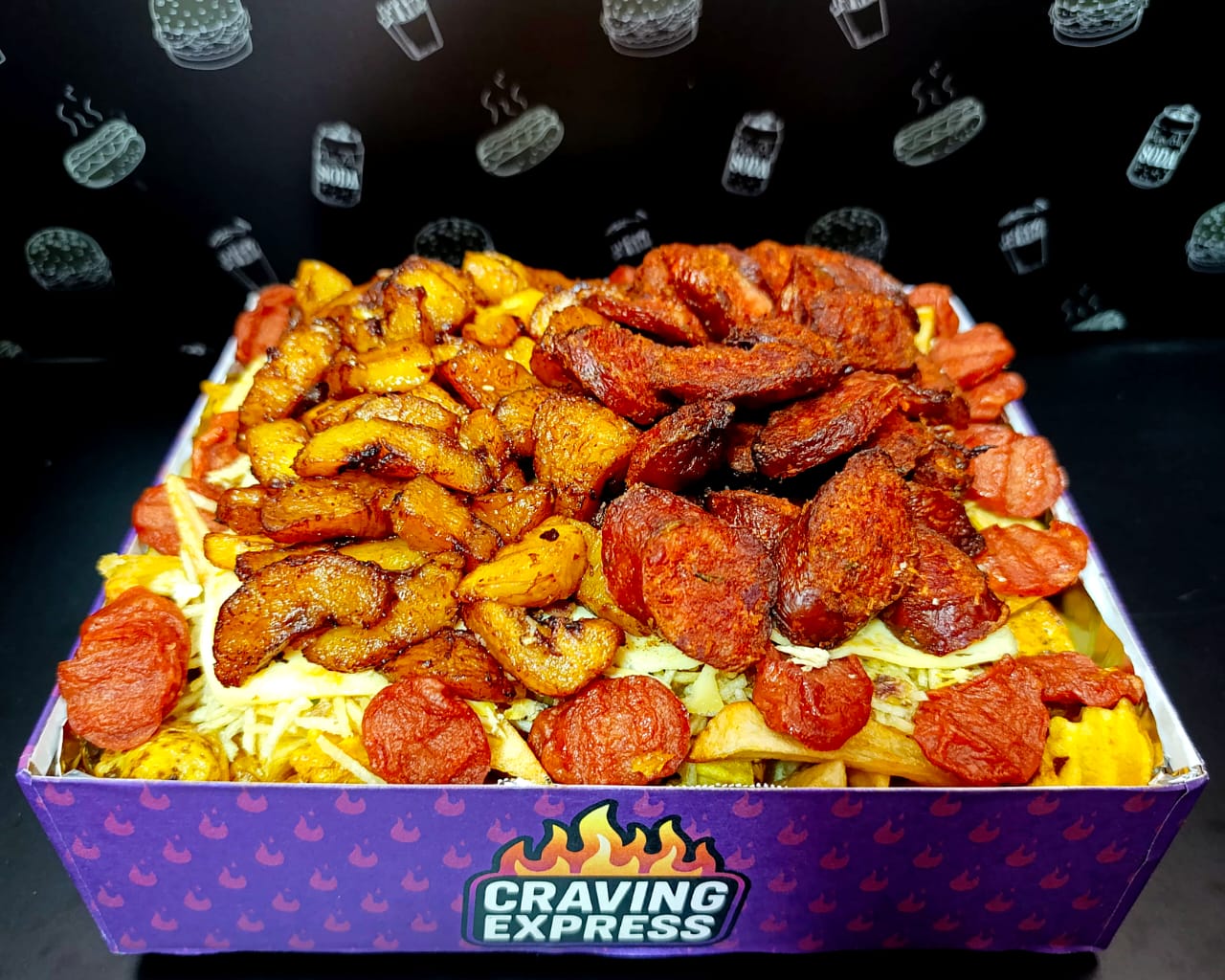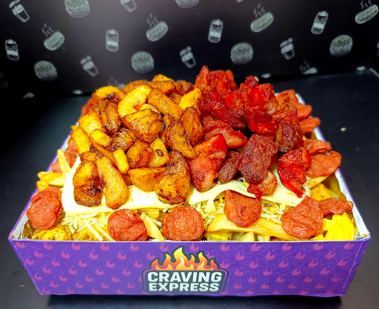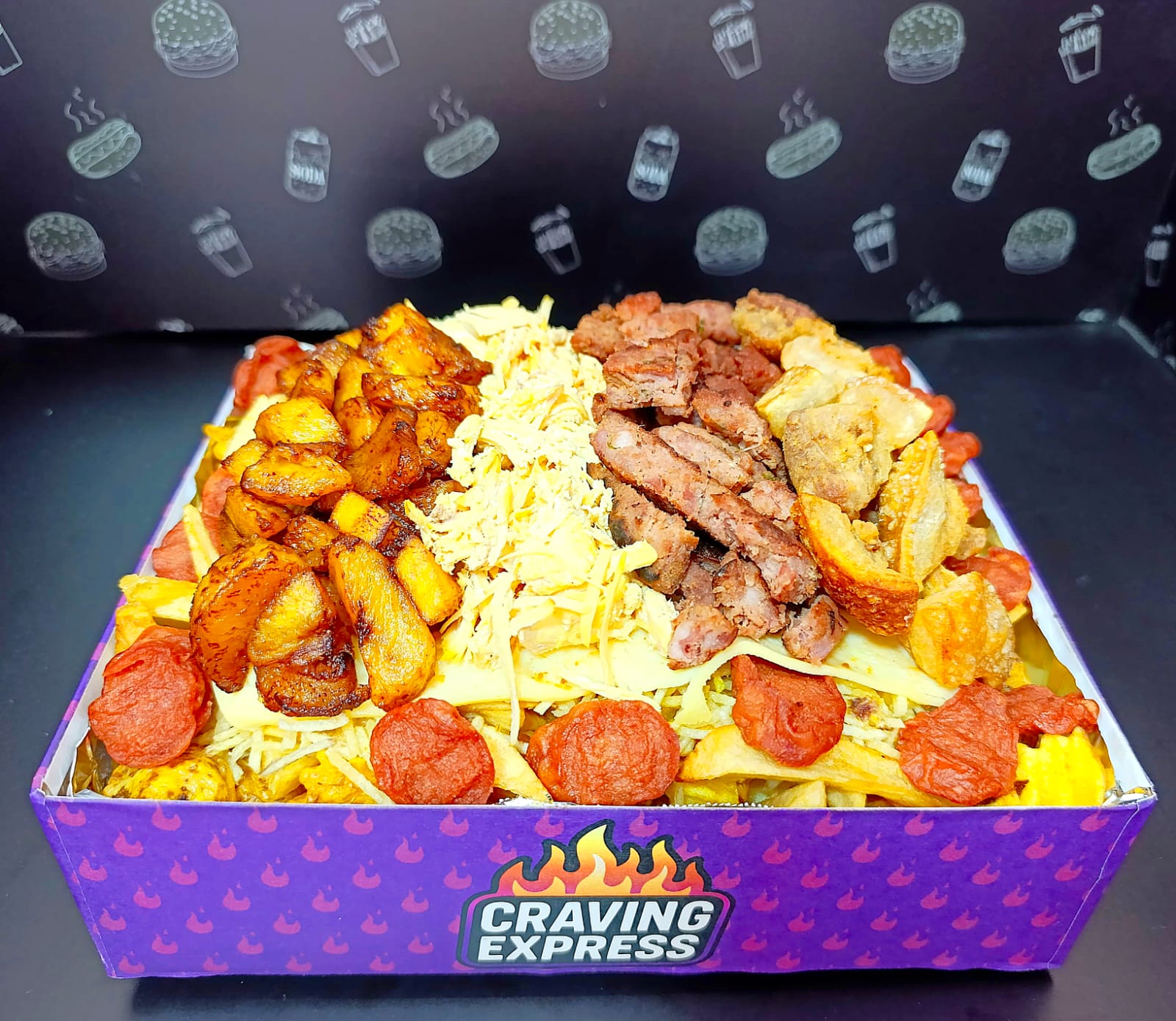 Salchi Chori Maduro (2‑3 personas, aprox. 700 g): Papas amarilla, papas a la francesa o combinación; salchicha, ripio, queso, chorizo, plátano maduro y salsas agregadas.