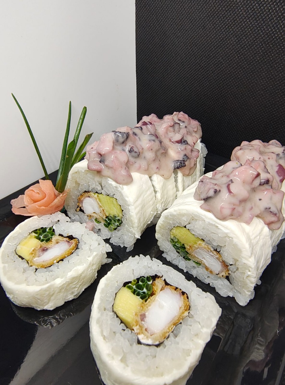Pulpo frito crispy, aguacate, cebollín, envuelto en queso crema, topping de pulpo al olivo en salsa acevichada.