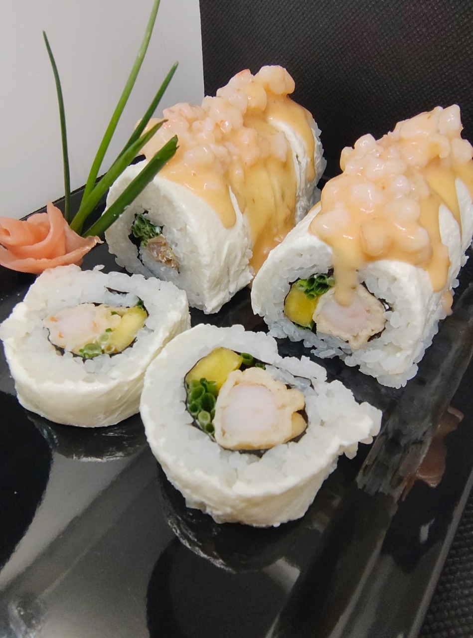 Camarón tempurado, mango, cebollín, envuelto en queso crema, ceviche costeño.