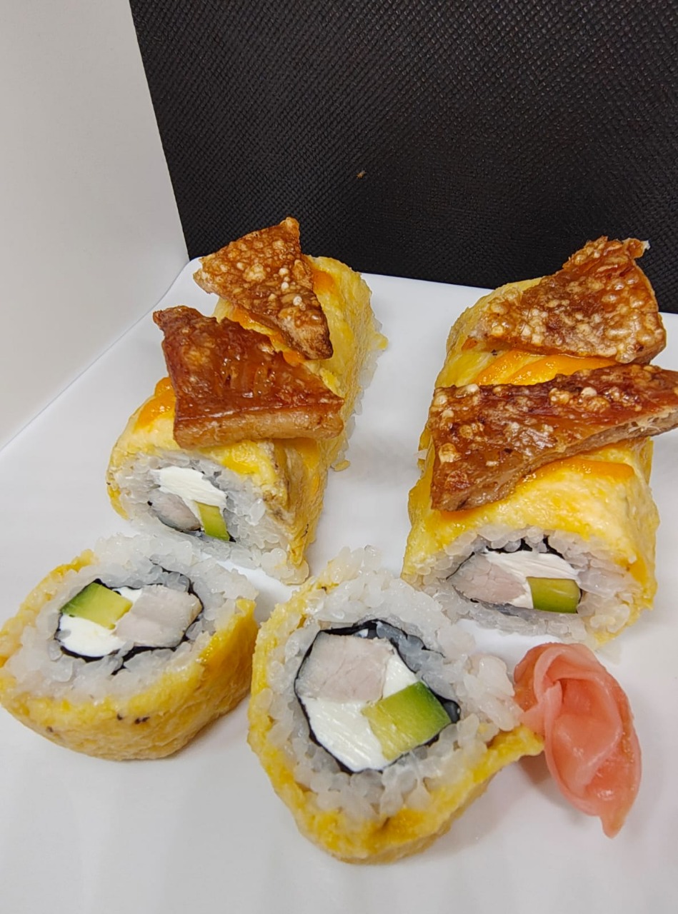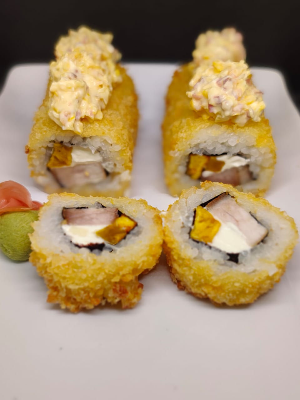 Rollo de sushi sin cortar: frito en panko relleno de Pollo Teriyaki, pasta de maduro y cebollin