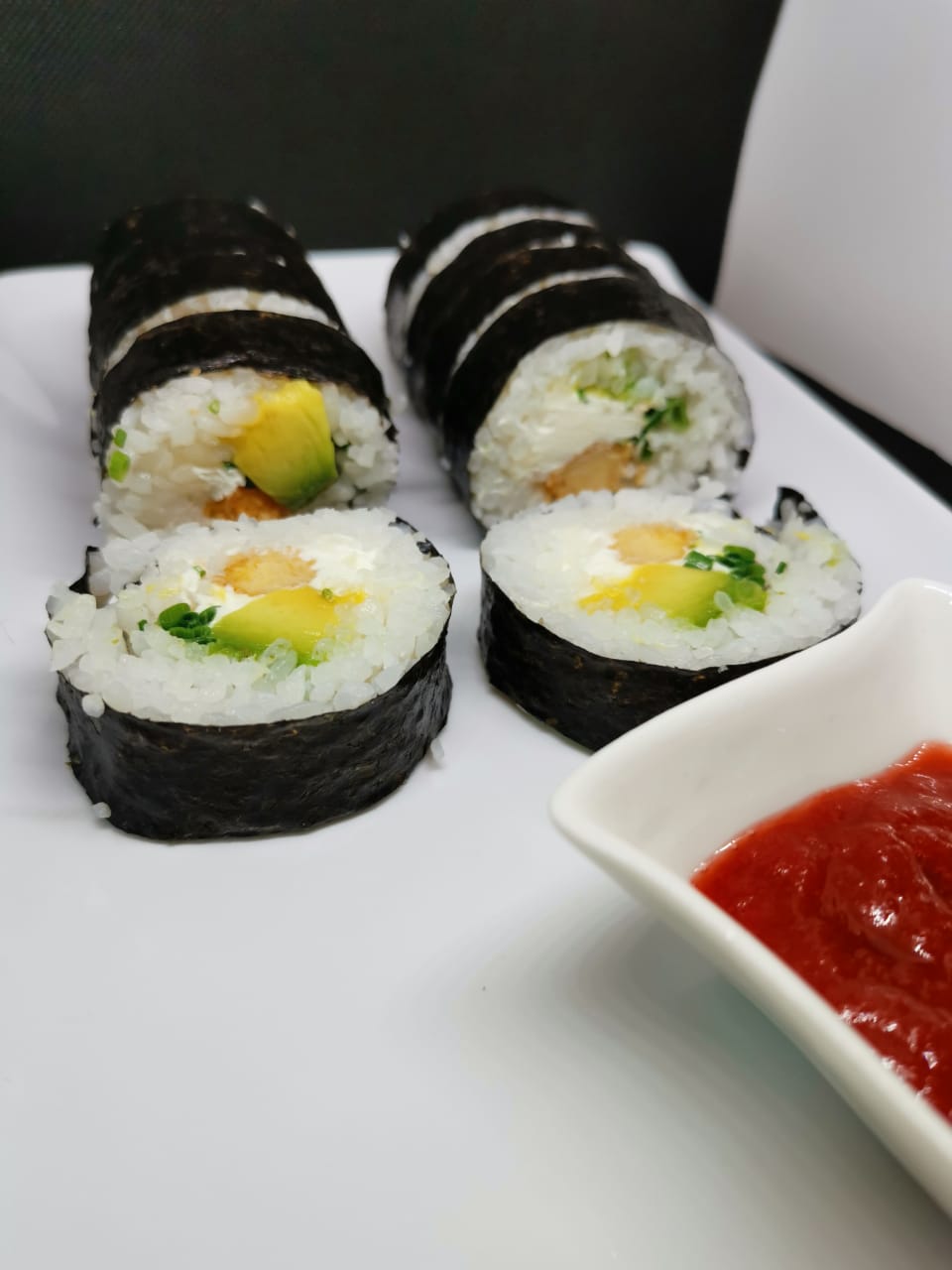 Pollo teriyaki, aguacate, queso crema, cebollín.