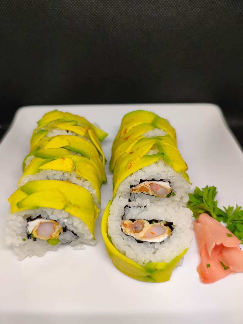 Camarón tempurado, aguacate, cebollín.