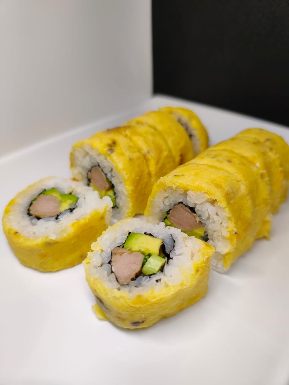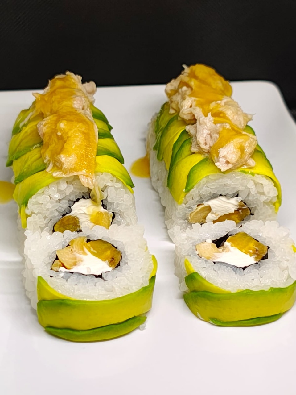 Pollo teriyaki, maduro, queso crema, envuelto en aguacate, cerdo en salsa de piña.