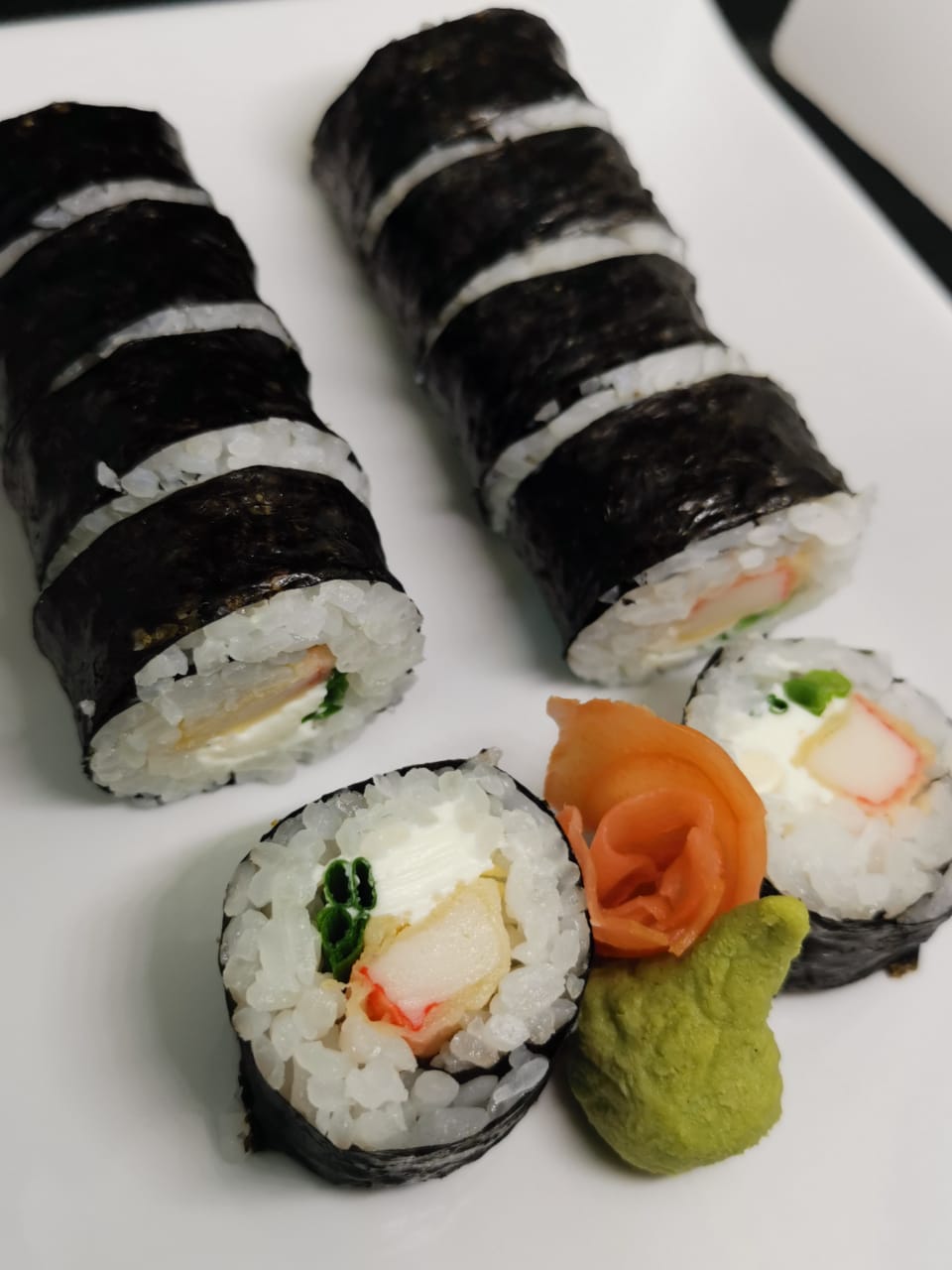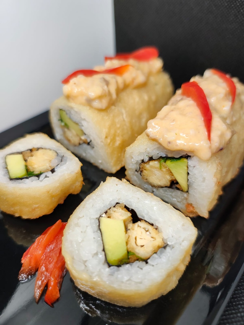 Kanikama tempurado, aguacate, queso crema, cebollín.