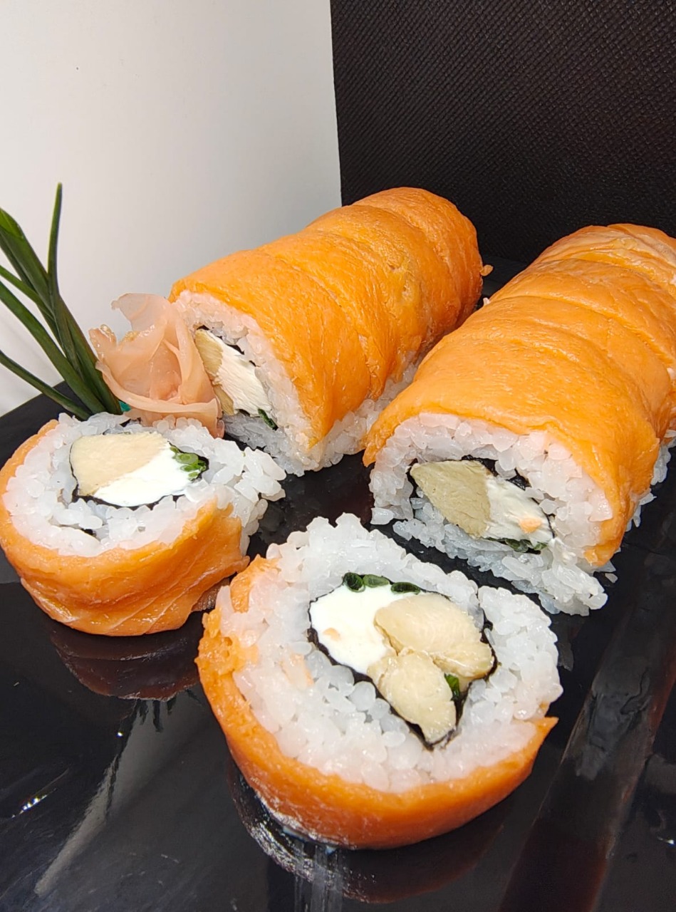Salmón, aguacate, cebollín. Envuelto en queso crema