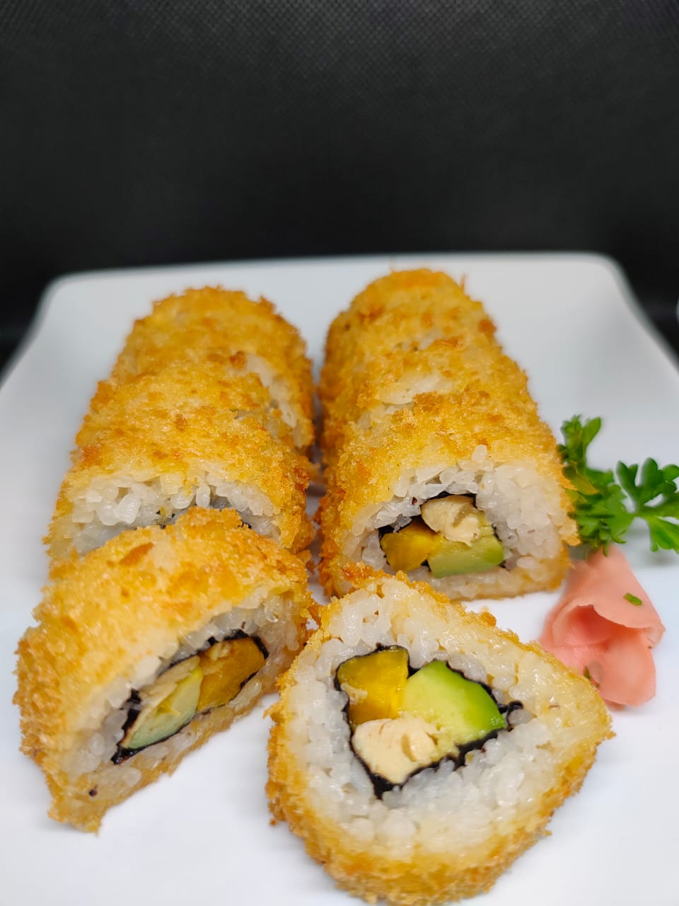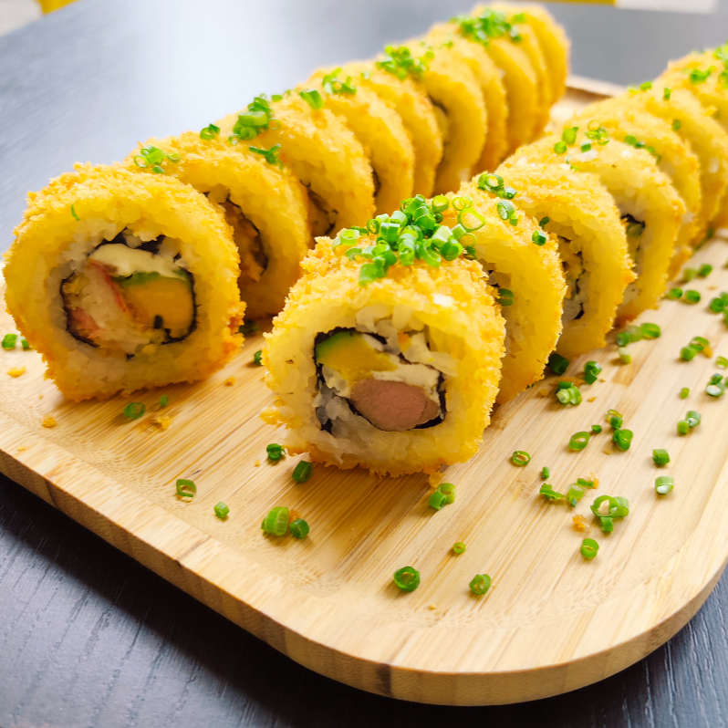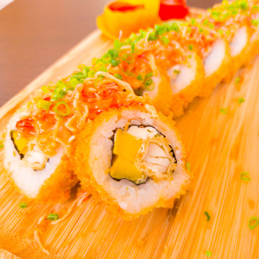 Rollo sin cortar: fcamarón tempura, mango, cebollín. Frito en Panko