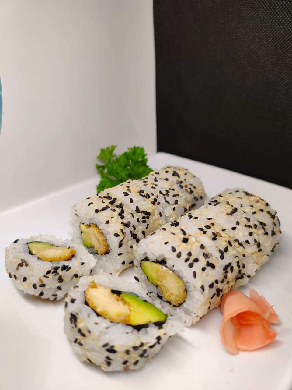 Cerdo teriyaki, aguacate envuelto con ajonjolí, amapola, cebollín.