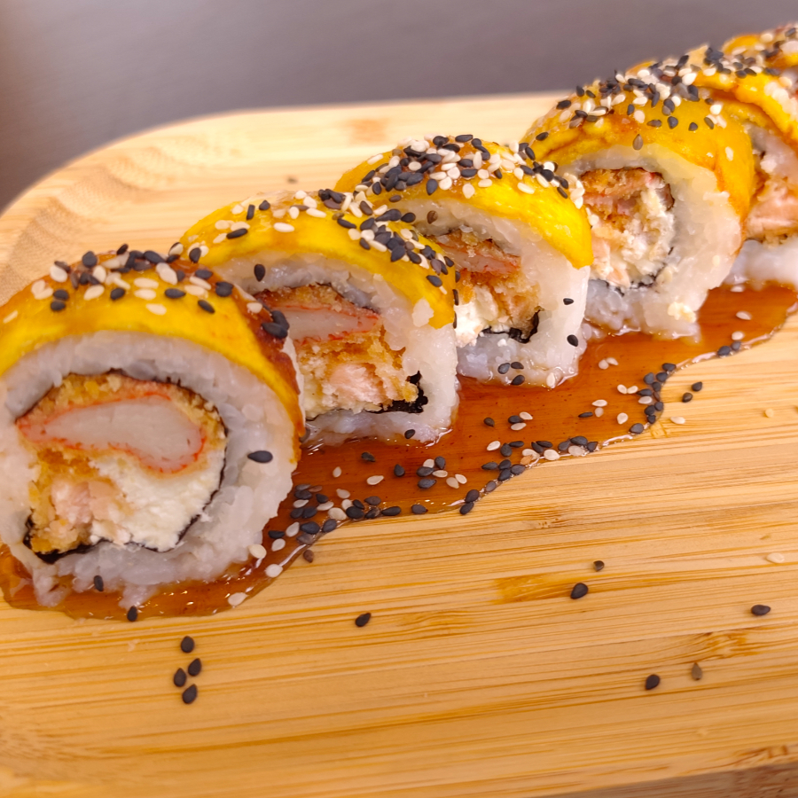 Tilapia apanada, mango, queso crema, frito en panko, ripio de kanikama en salsa dinamita. 10 bocados