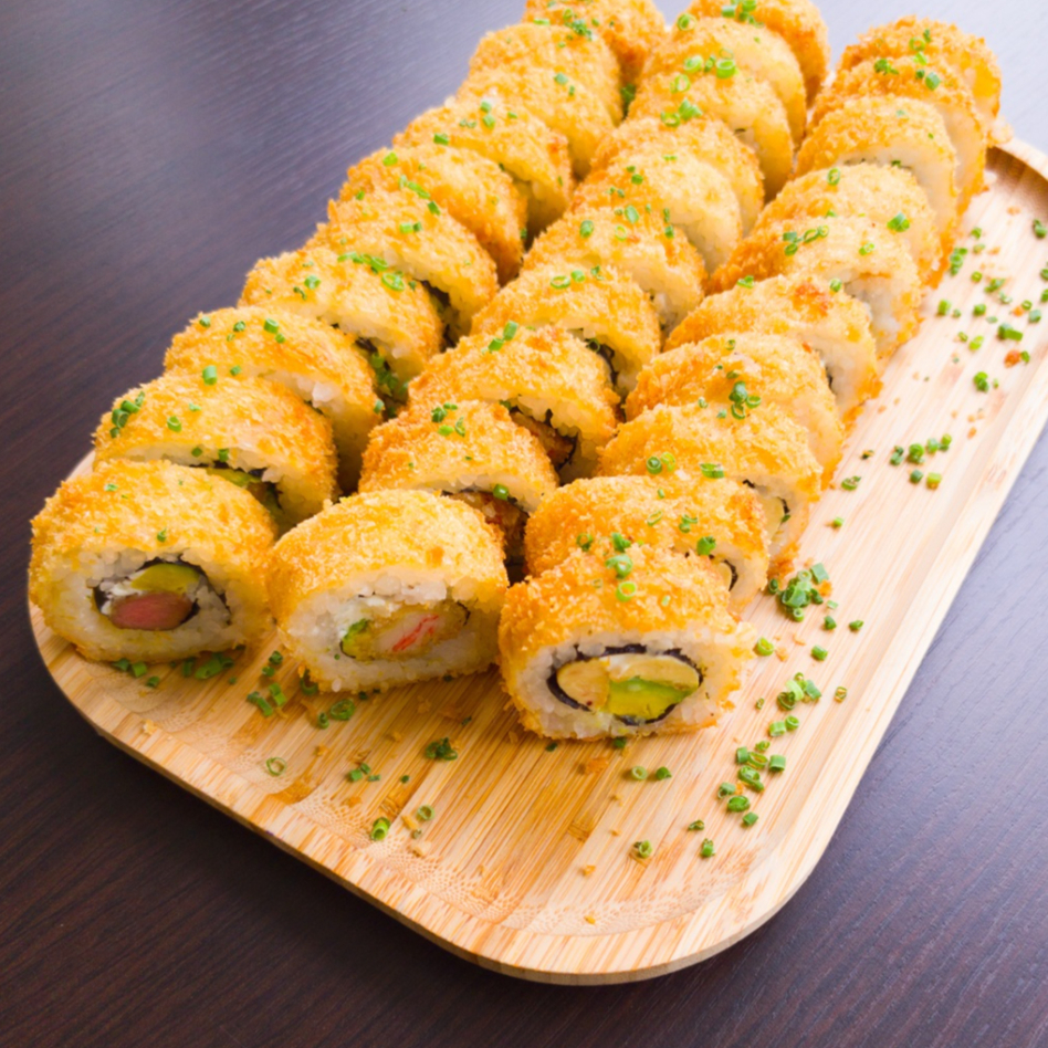 Kanikama apanado, aguacate, queso crema, cebollín.