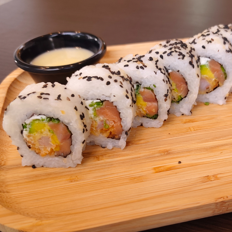 Salmon, aguacate, queso crema. Envuelto en ajonjolí