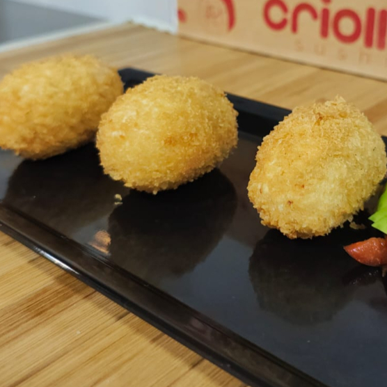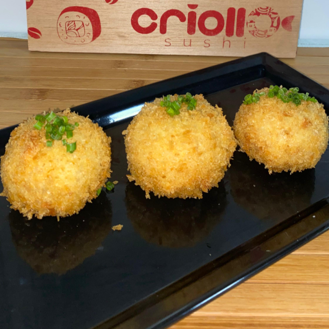 Cerdo, maduro, queso crema, arroz, frito en panko. 3 unidades
