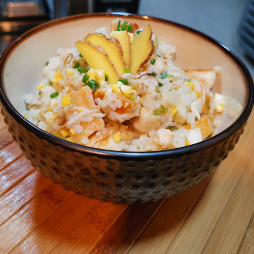 Pollo, arroz frito, huevo, cebolla, calabacin, cebollin